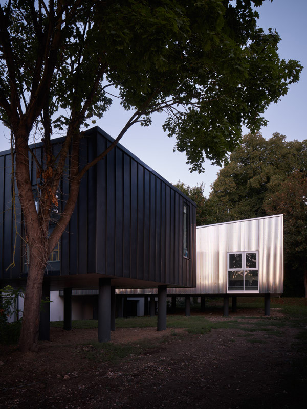 L’inclinazione della copertura dei due padiglioni permette un apporto di luce non indifferente, nonostante la sua posizione. Per garantire una continuità con gli edifici esistenti, le estensioni si mantengono su dei pilotis e si inseriscono tra gli alberi, con vista sulla zona urbana e sulla vegetazione circostante
