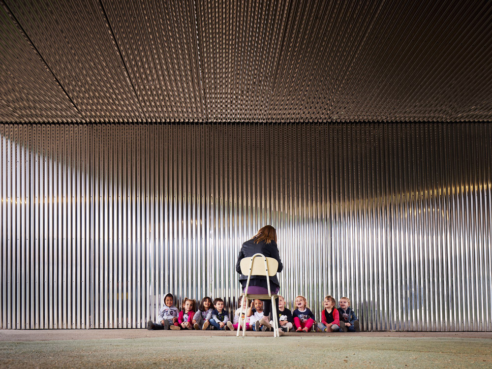 La terza estensione ha le sembianze di un rifugio dalle grande dimensioni, e si trova in un punto di transizione tra spazio pubblico e la corte. La copertura si inclina per connettersi con l’edificio esistente