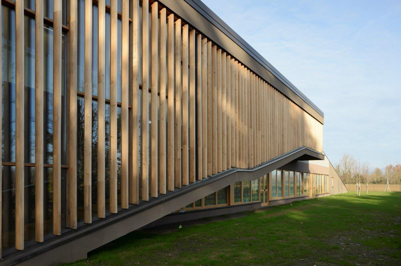 Polo scolastico con struttura in legno. Un edificio sostenibile con tetto verde per insegnare l’ecologia