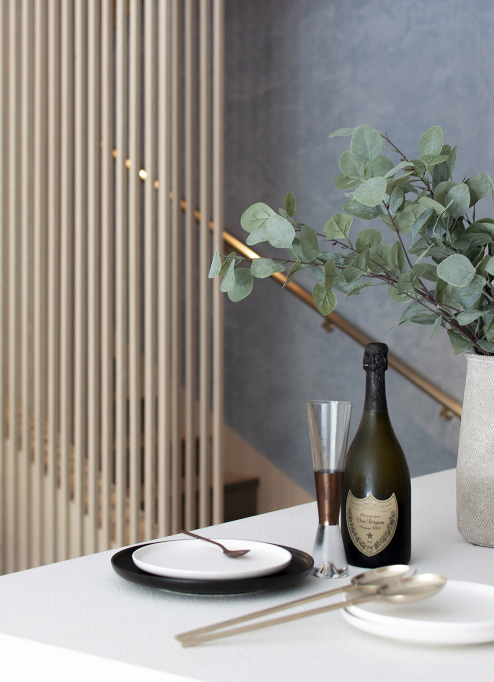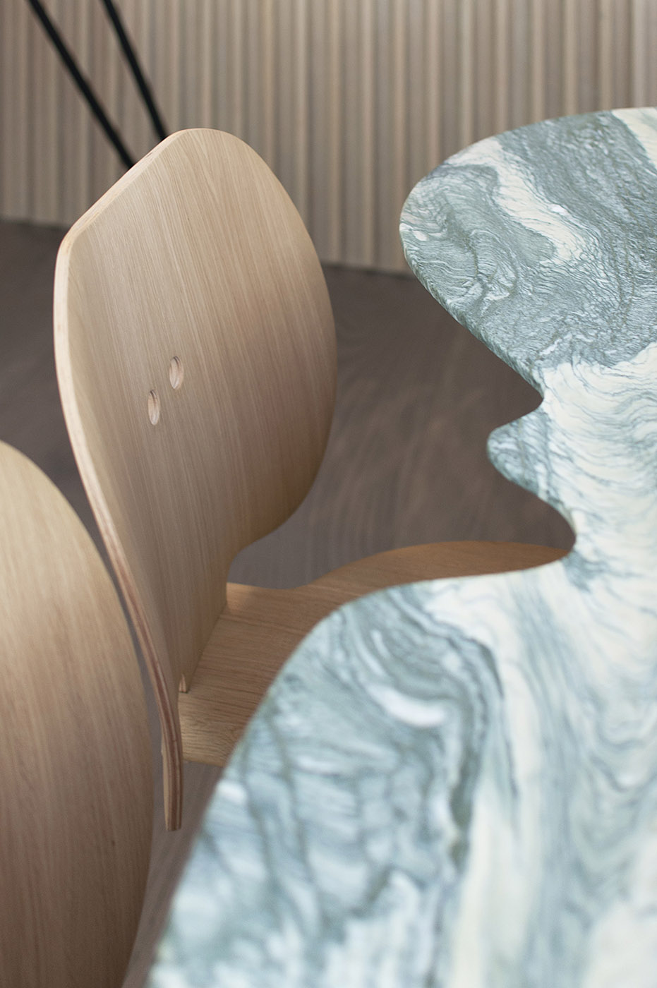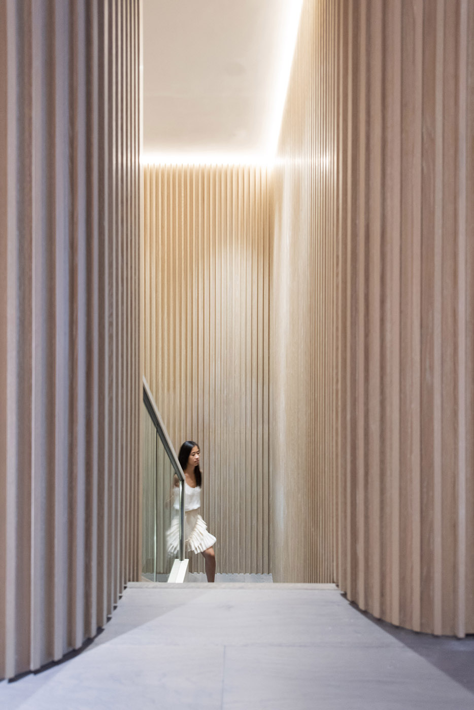 Per creare un senso di movimento, verticalità e continuità sulle pareti si è optato per l'uso di doghe in legno a tutta altezza su superfici curve, creando un senso di calore e intimità. Le doghe continuano anche nel corpo scala, creando continuità tra i due piani