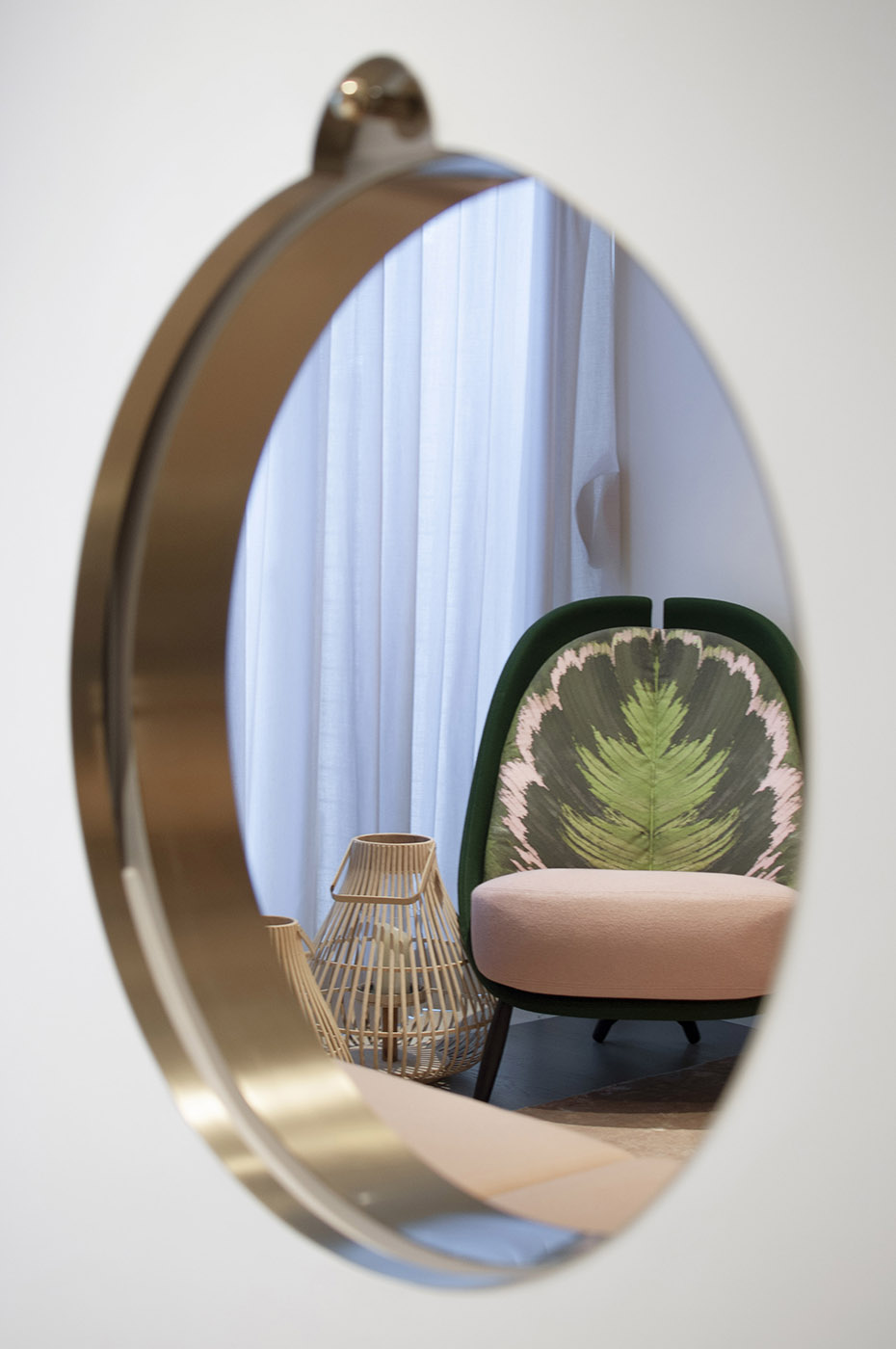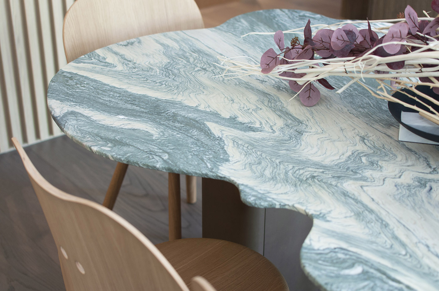 Una finitura esclusiva in marmo verde è la caratteristica principale del piano sociale, con venature e motivi unici, che creano un dialogo con il verde esterno. In varie pareti divisorie interne dell'appartamento vi sono delle aperture circolari che creano soglie giocose tra le stanze