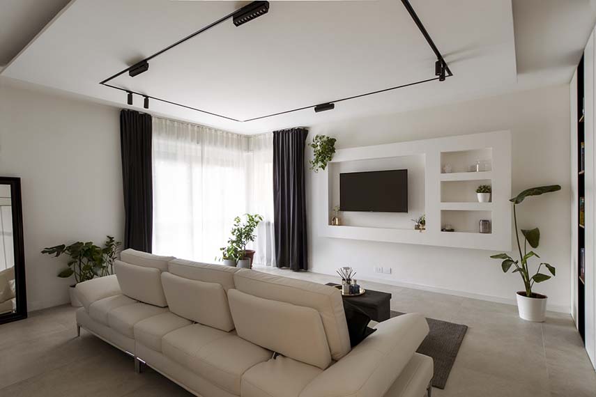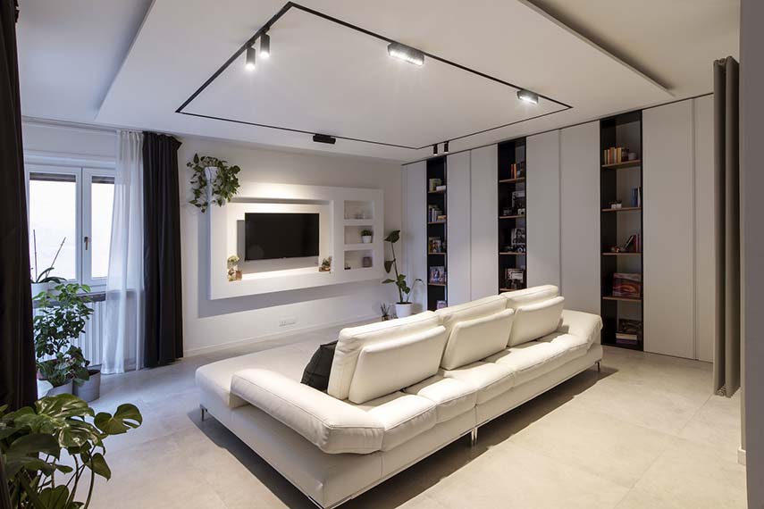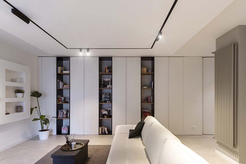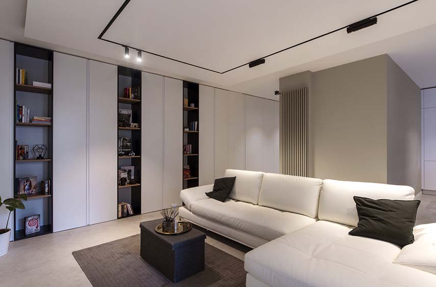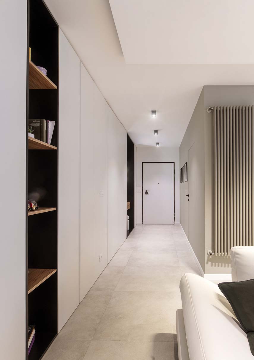 Una giovane coppia e il loro inseparabile amico a quattro zampe possono ora godere della ristrutturazione della nuova casa grazie al progetto di KK Architecture. L’appartamento FEL presenta un ampia zona soggiorno con salotto e cucina uniti visivamente e legati dallo stile moderno ed elegante che guida tutto il progetto. Il “gigante bianco” una quinta contenitiva che nasconde sapientemente spazio di servizio conduce dall’ingresso al soggiorno, trasformandosi prima in elegante nicchia svuota-tasche, poi in vani a giorno per il salotto
