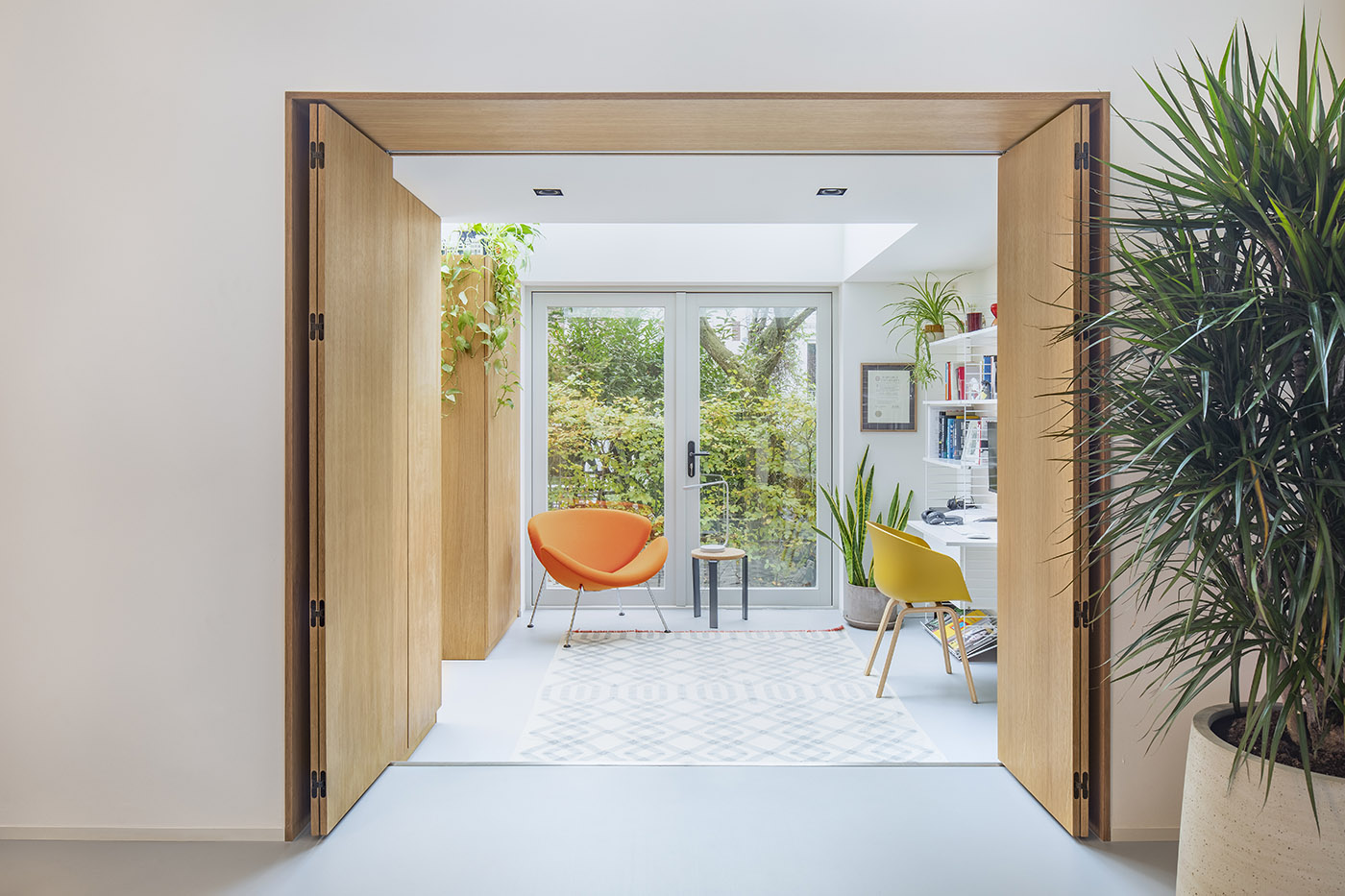 Uno spazio grande ed arioso diventa quindi accogliente grazie ad una serie di scelte d’arredo su misura rese ancora più flessibili dalla presenza di soluzioni tecnologiche innovative. Ci sono poi: il divano dai colori sgargianti, il ricorrere di elementi in rovere, il tappeto in tessuto grezzo e naturale e le numerose piante da interni che contribuiscono a conferire un’atmosfera calda e domestica, andando a creare un distintivo connubio di intimità e design all’avanguardia.