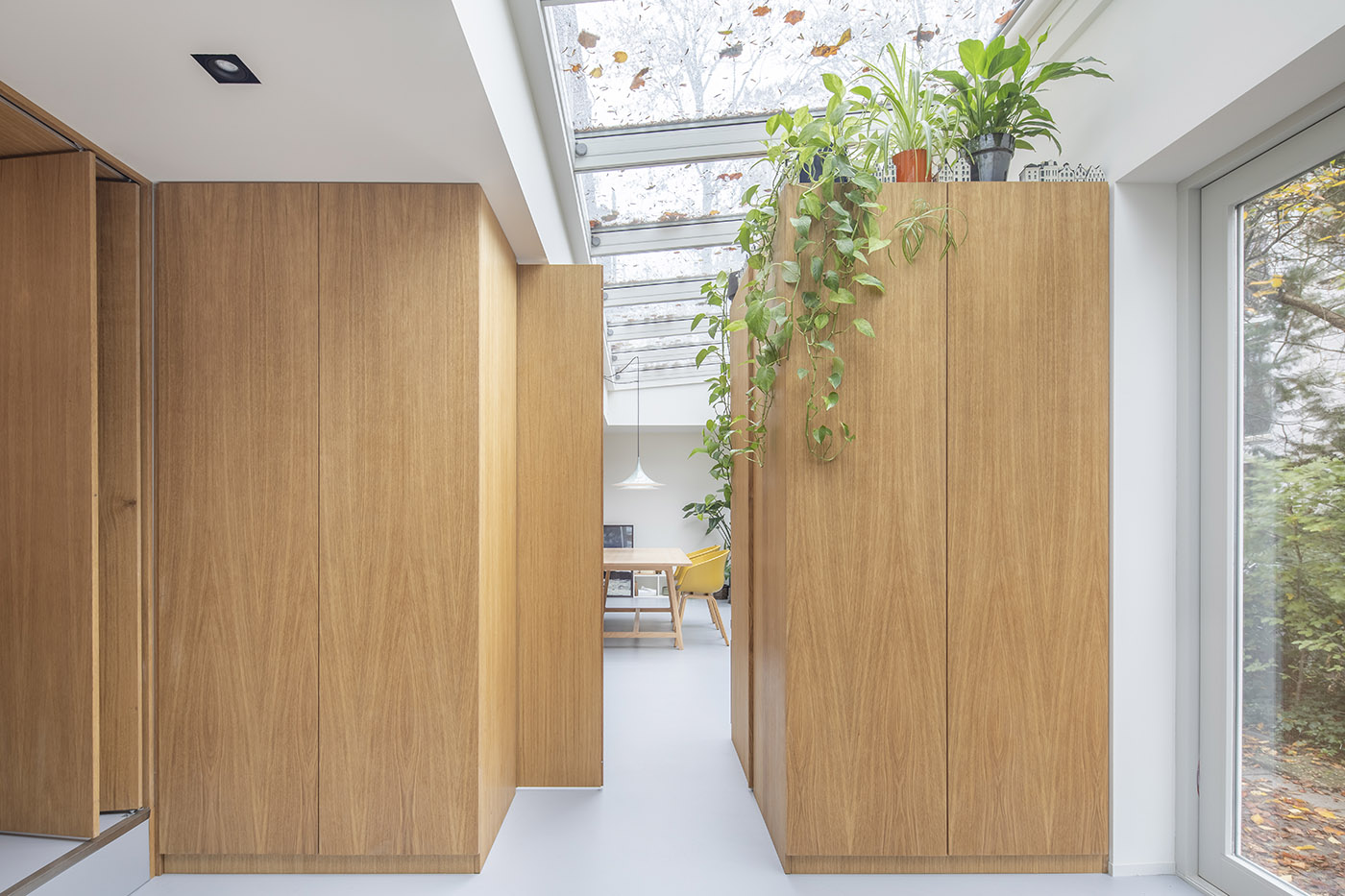 Svoltando l’angolo accanto alla libreria pivotante, si accede poi ad uno studio e ad una veranda chiusa che possono essere separati dagli altri ambienti grazie alle porte a fisarmonica poste posteriormente alla cucina. Inoltre, nella veranda chiusa è presente anche un grande tavolo da pranzo per tutta la famiglia. Questo spazio può essere chiuso separandolo dallo studio grazie ad un’ingegnosa parete-credenza dotata di porta scorrevole