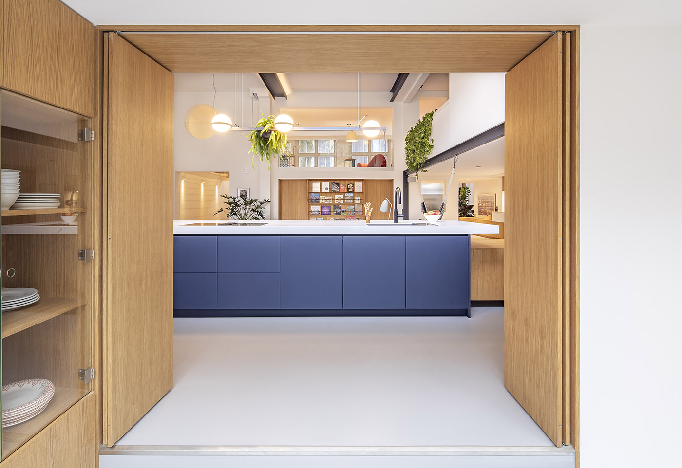 Gli elementi divisori hanno quindi svolto una funzione fondamentale, quella di creare equilibrio tra gli spazi. La soluzione più intrigante è sicuramente la grande libreria-mobile TV all-in-one che può fungere da home cinema e può trasformare lo spazio creando una stanza da letto extra per gli amici che decidono di rimanere per la notte