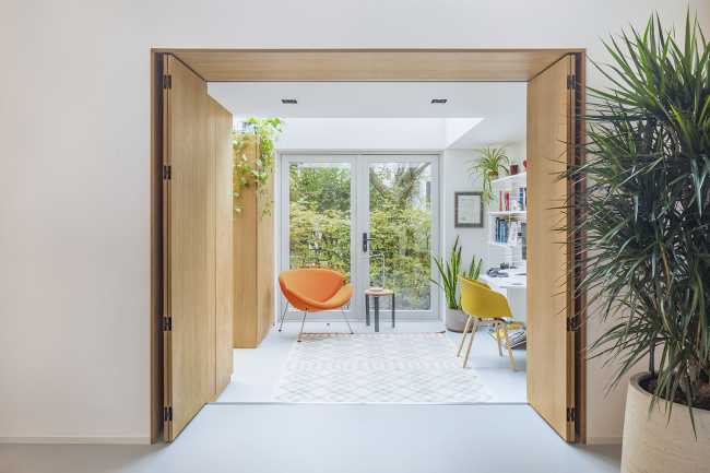Una soluzione che funge da diaframma con il grande spazio living e rimane funzionale su entrambi i lati, uno concepito come parete TV, l’altro come libreria su cui disporre i propri libri del cuore come in una sorta di mostra. Un elemento divisorio imponente messo in movimento e sostenuto da un sistema di cerniere pivot System 3 di FritsJurgens e da una cerniera superiore con passacavo, sempre di FritsJurgens, che consente di celare alla vista i cavi della TV