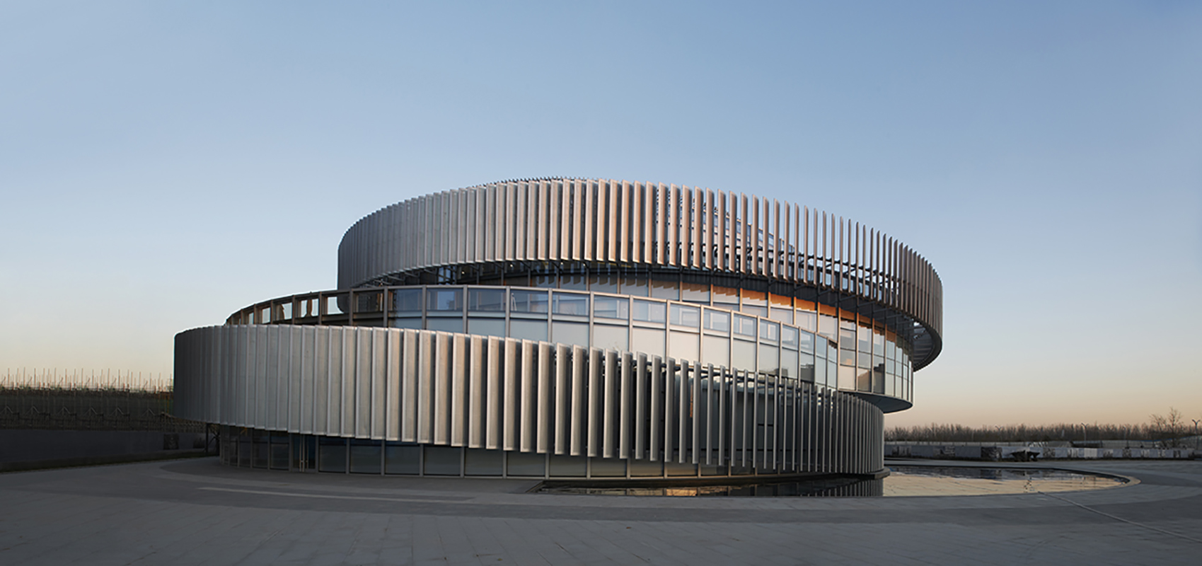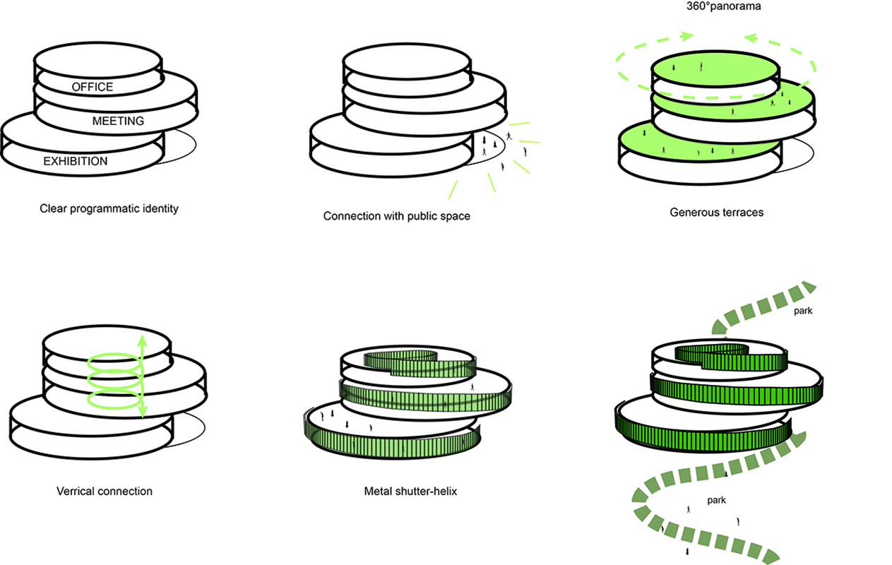 La carattetistica dell’innovazione, del il suo potenziale all'avanguardia e dell’illimitato sviluppo, sono tutti fattori importanti da considerare per i progettisti. Il passaggio curvilineo funge da asse della vita e collega il nord e il sud del parco. Il centro espositivo, di forma ellittica, il cui design è integrato nel paesaggio centrale, si trova al centro dell'asse. La “stratificazione”, come caratteristica architettonica, ne fanno l'edificio simbolo che precede la costruzione del parco