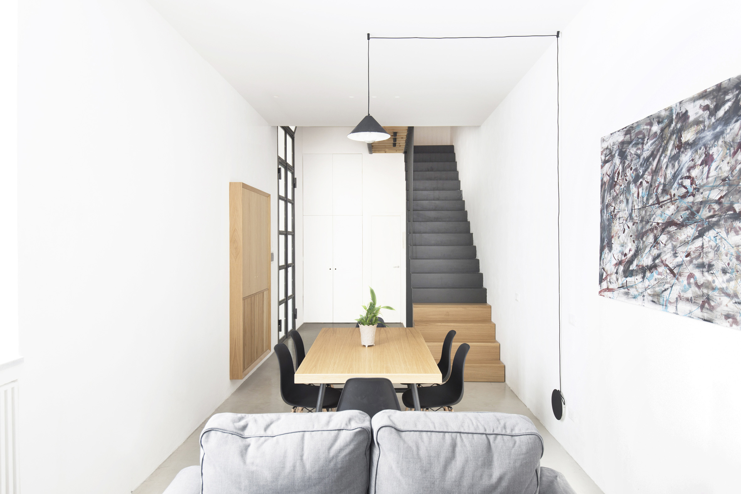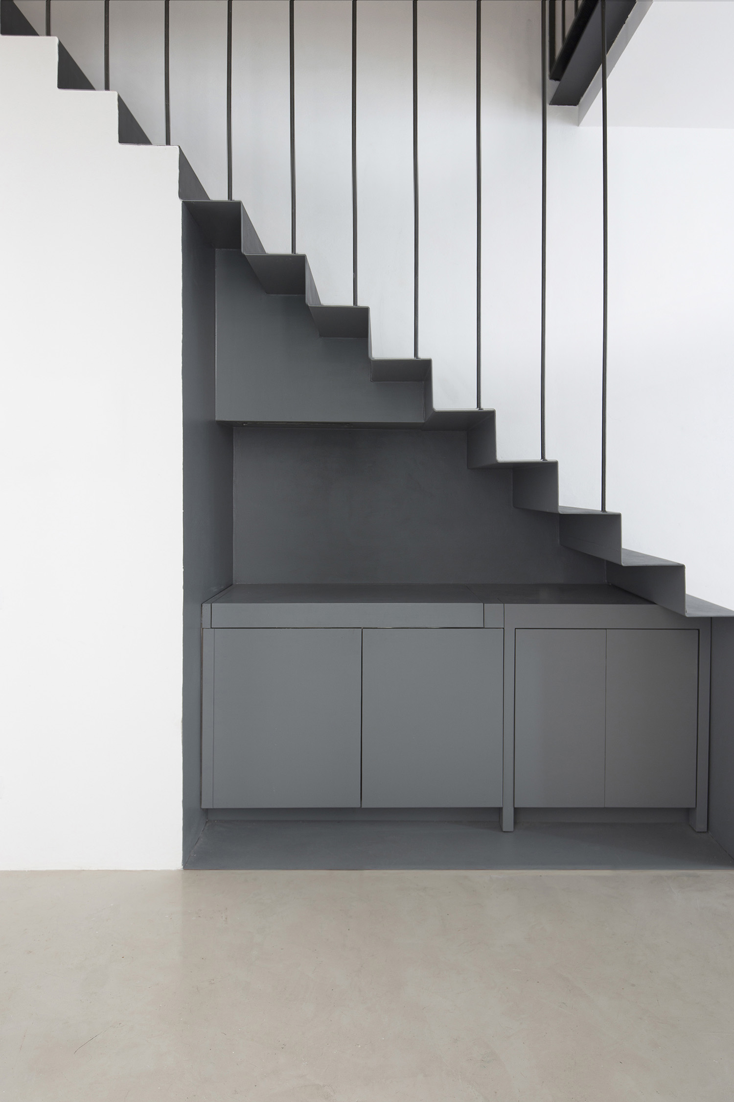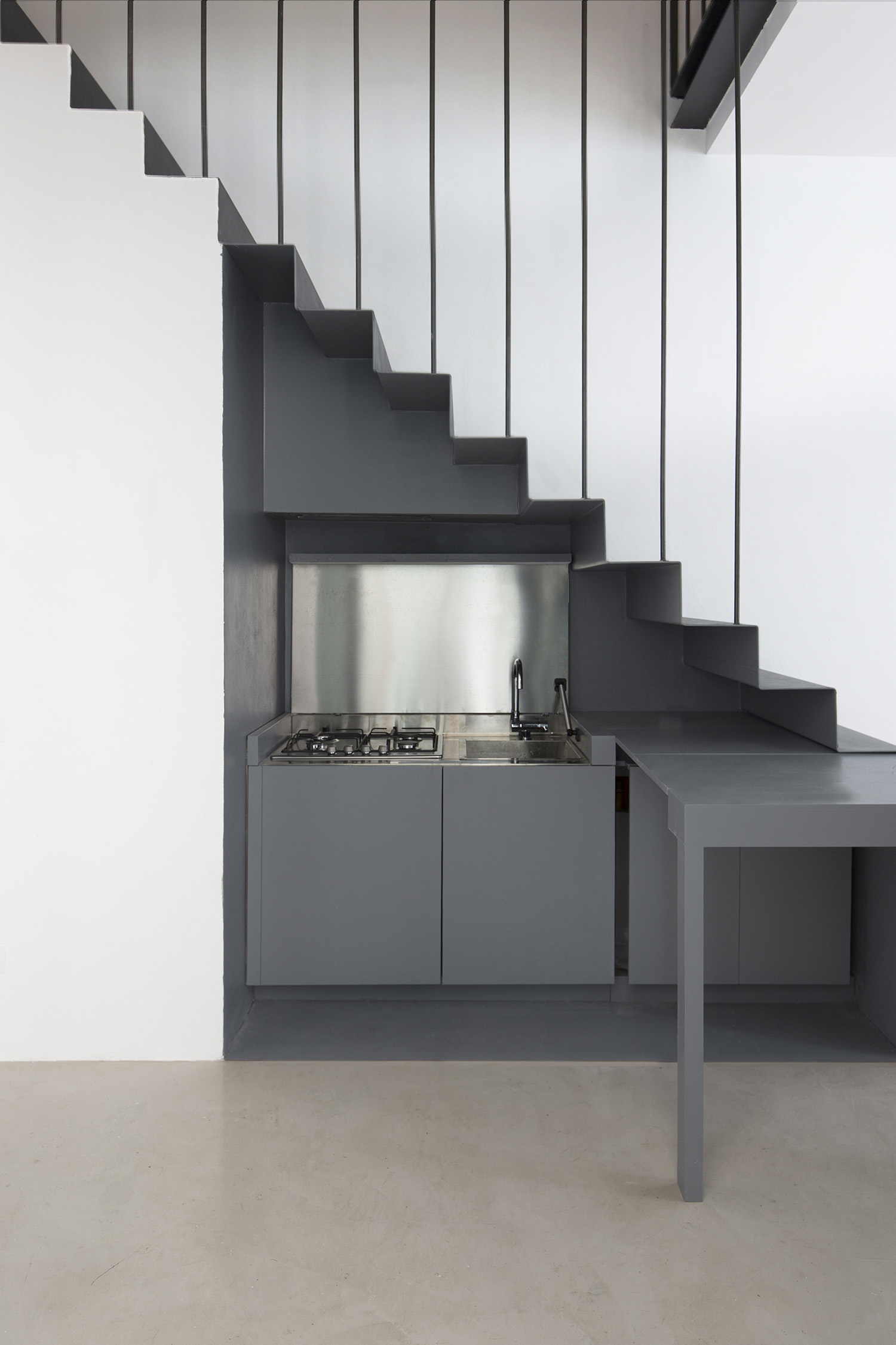 Protagonista di tutto l’ambiente è il corpo scale, di colore grigio antracite che lo fa risaltare sullo sfondo chiaro, concepito come un volume funzionale che integra al suo interno la cucina inserita nel sottoscala. Per ottimizzare lo spazio il mobile della cucina viene realizzato su misura: chiuso è una madia a servizio della zona giorno, aperto diventa un piano cottura con quattro fuochi, lavello in acciaio, e tavolo da pranzo a ribalta