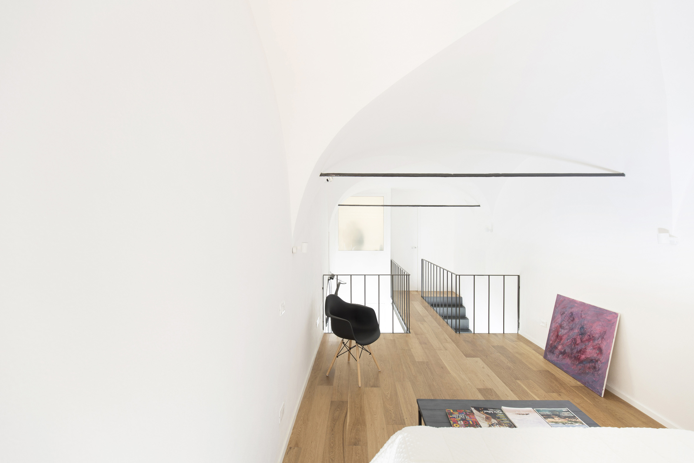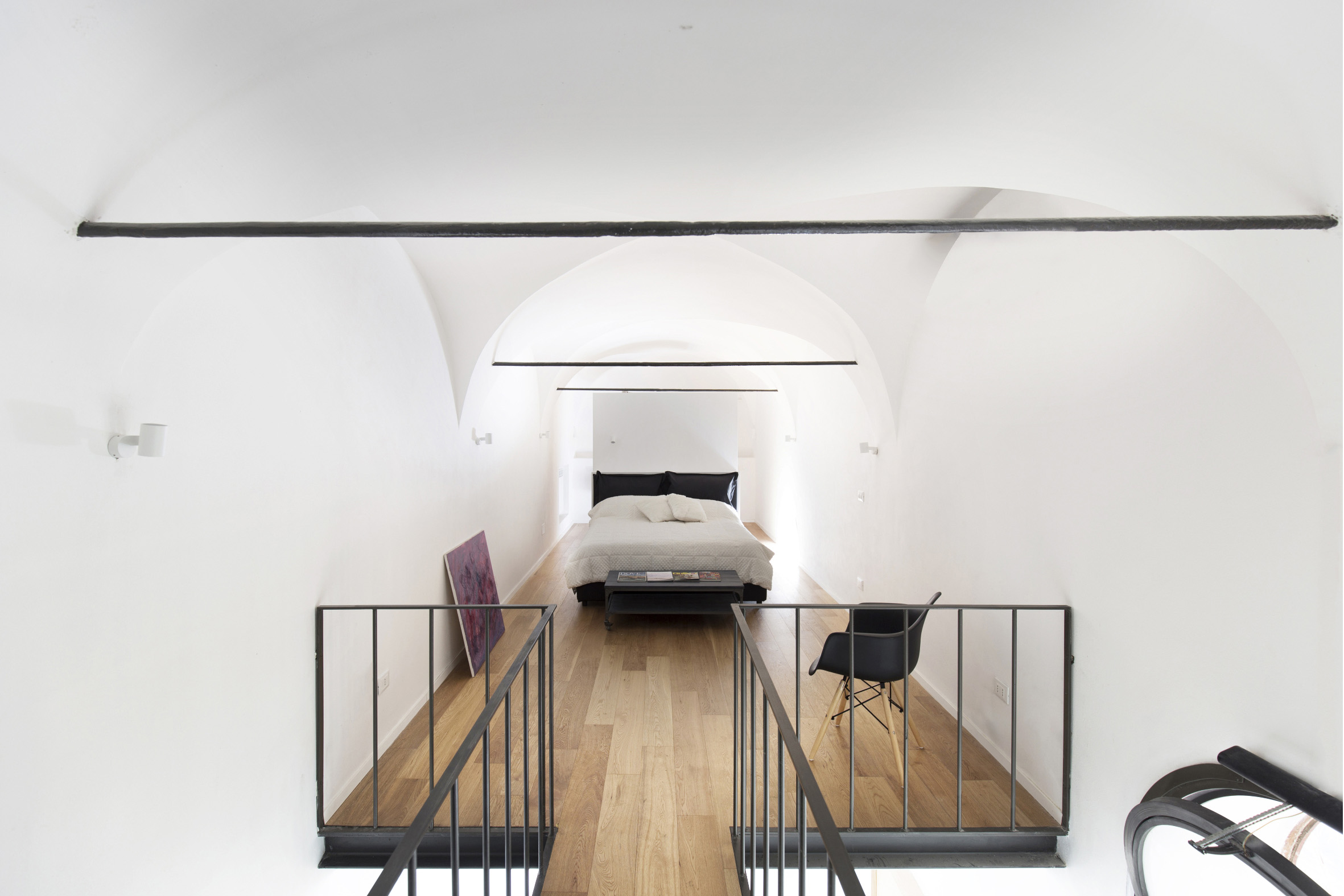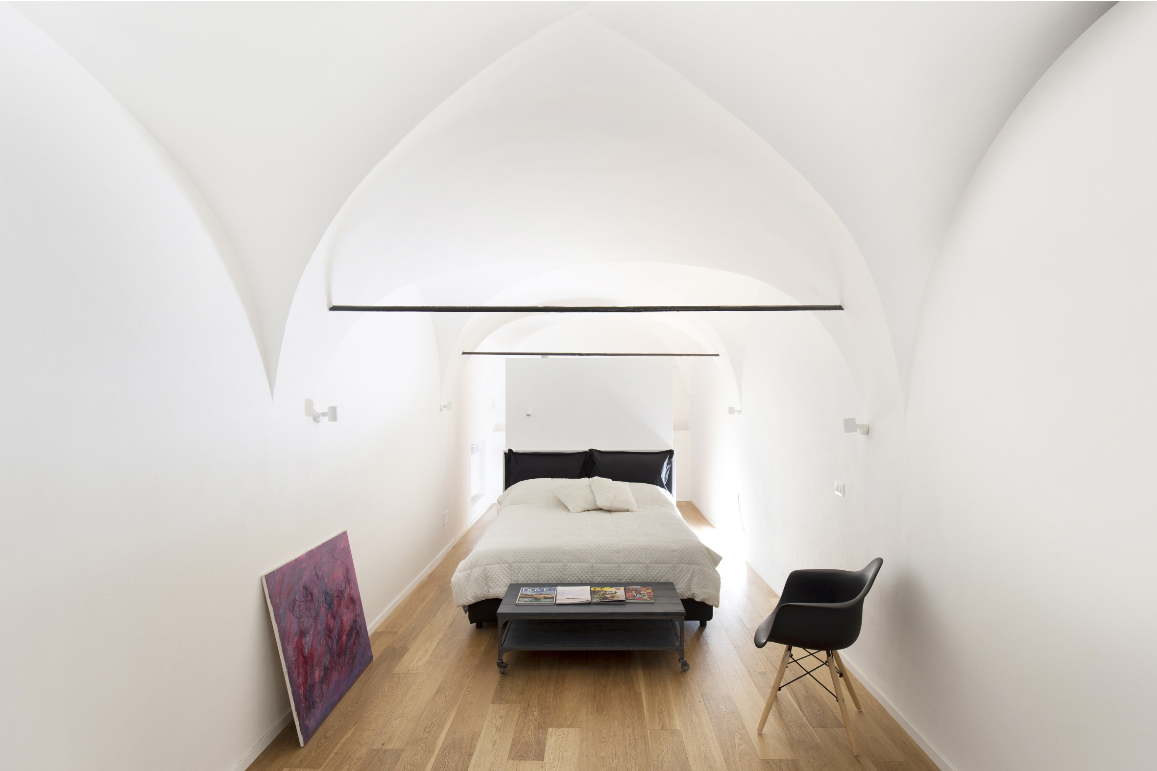 Ad esclusione del bagno, realizzato in resina grigia, l’intera superficie della zona notte è rivestita da un parquet in rovere naturale. Spot luminosi posizionati all’imposta delle volte enfatizzano il soffitto con volte a crociera