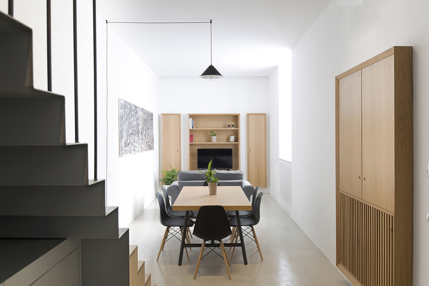 L’appartamento, disposto su due livelli e caratterizzato da uno sviluppo longitudinale di 3 metri x 11 con copertura a volte a crociera, presenta una serie di difficoltà legate principalmente alle dimensioni ridotte e alla scarsità di luce naturale: unico punto di luce del immobile sono infatti due alte aperture affacciate sulla corte interna