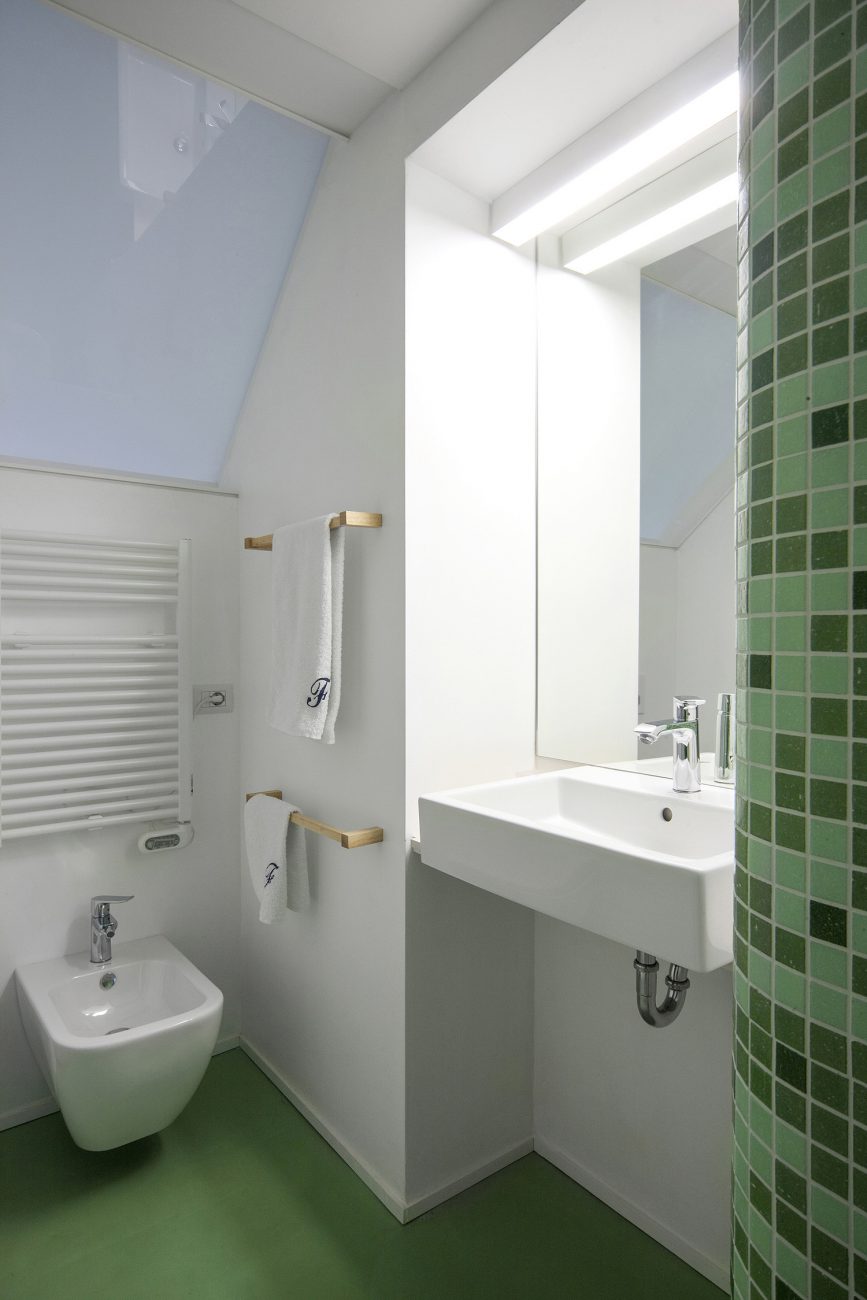 L’interno del bagno è trattato in modo diverso rispetto al suo esterno. Il colore scelto è una leggera gradazione di verde e le superfici sono trattate con malta cementizia lisciata e mosaico