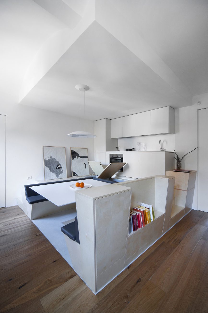 Tutta la struttura, su diversi livelli, ha la caratteristica di “aprirsi” con una serie di scomparti orizzontali, botole, cassetti, ante. Lo spazio disponibile per oggetti e casalinghi è più che doppio rispetto ad una soluzione tradizionale. Il tavolo in Corian®, così come il top della cucina, è di dimensioni 120x140cm allungabile fino a 200cm
