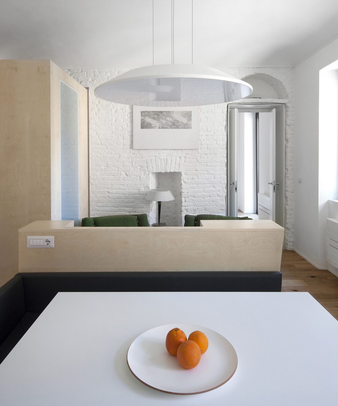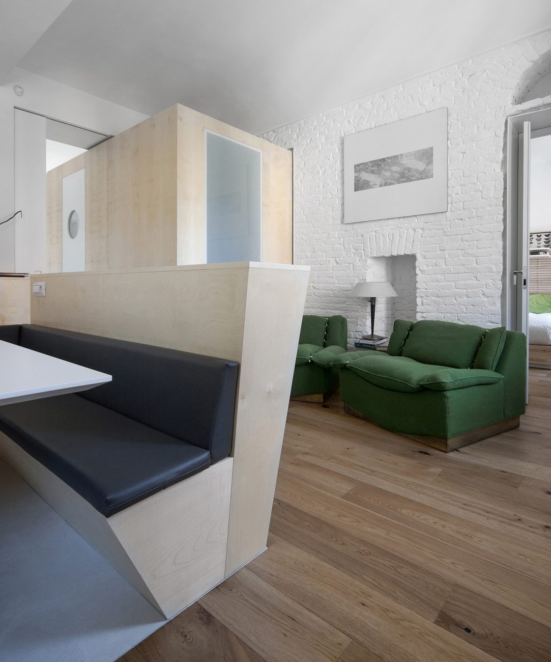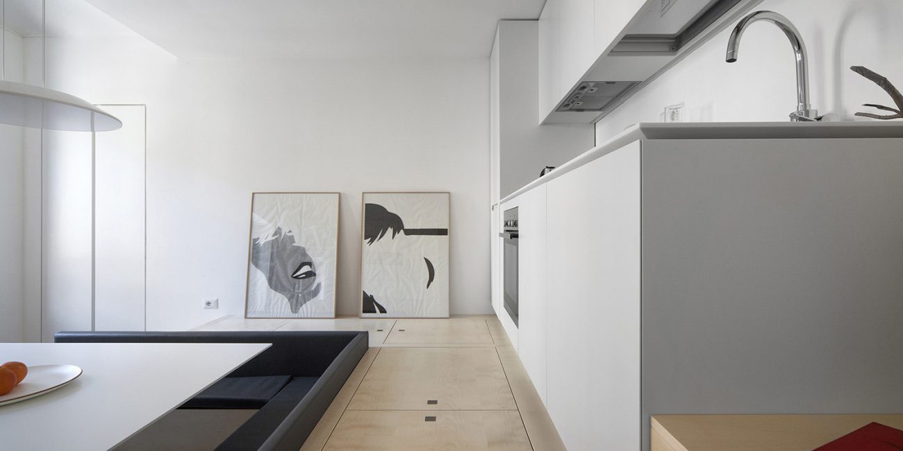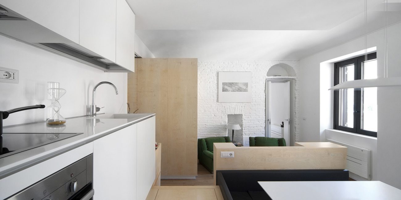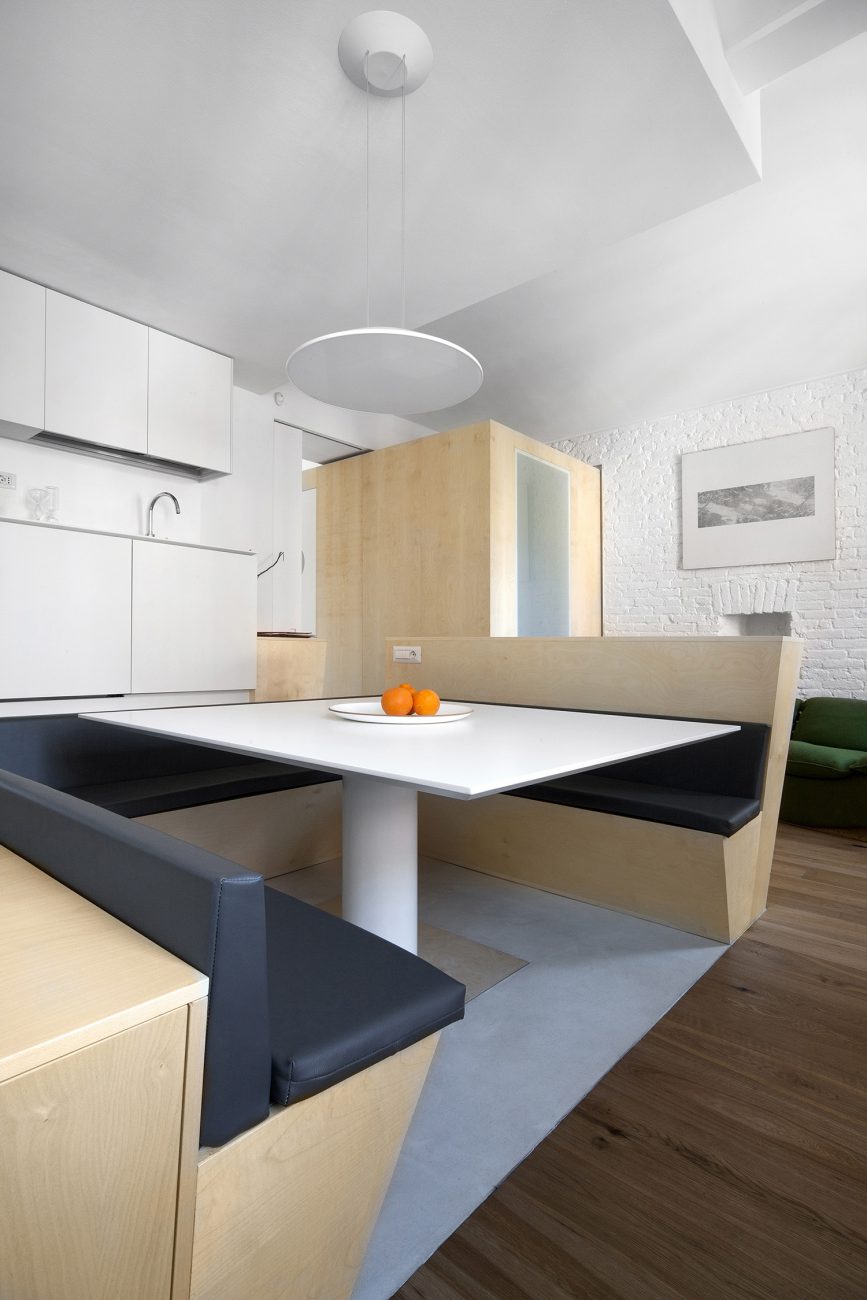 Lo studio ricerca un ambiente luminoso come tema principale della ristrutturazione di questo appartamento di 70 mq a Torino. Un volume ligneo in posizione dominante e centrale ridisegna gli spazi