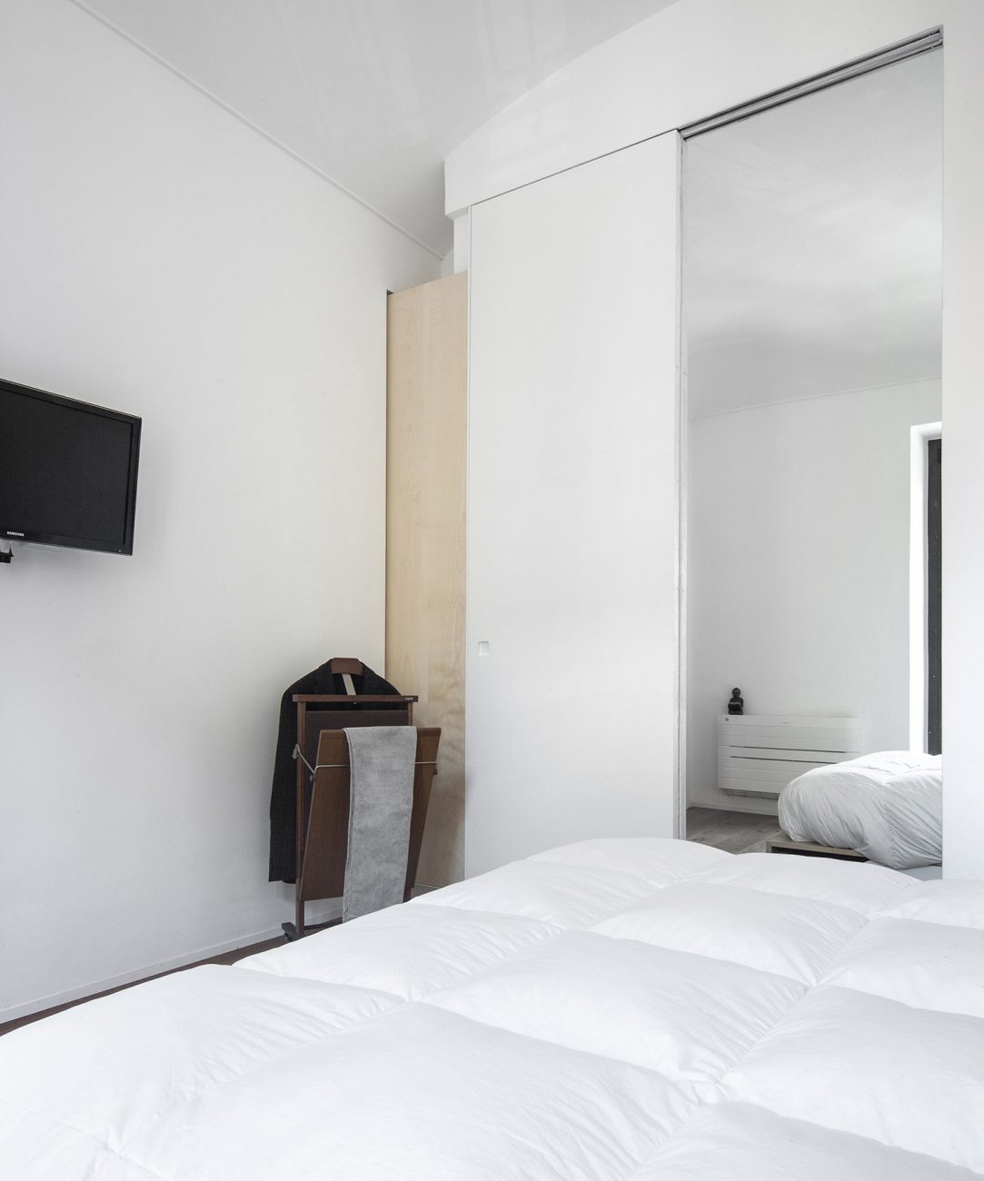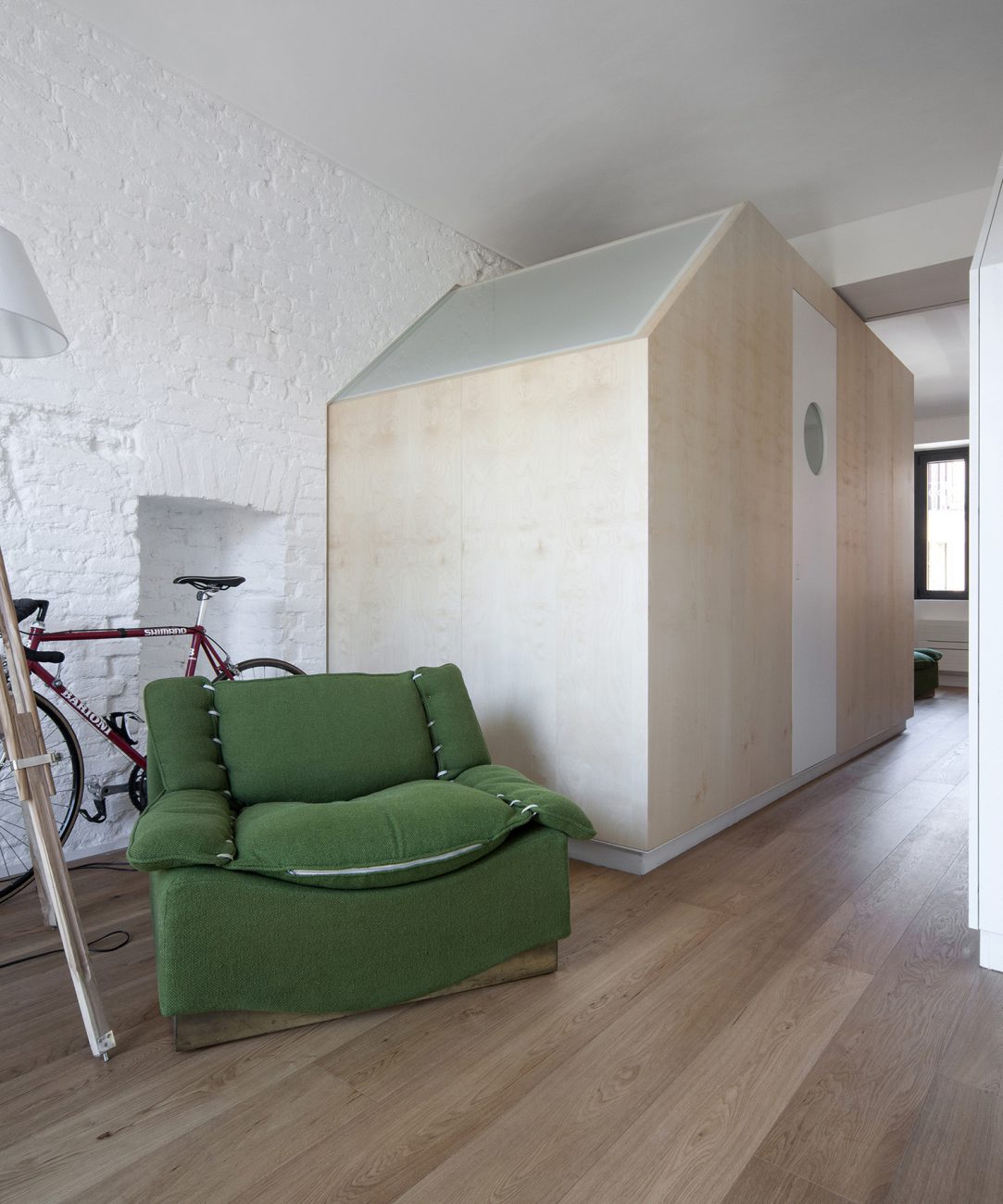 Nella planimetria dell’appartamento, su doppia esposizione Est-Ovest, ha preso posizione centrale dominante, un sistema definito da un volume ligneo che ridisegna gli spazi, definisce i percorsi ed ha la triplice funzione di bagno, doccia e cabina armadio