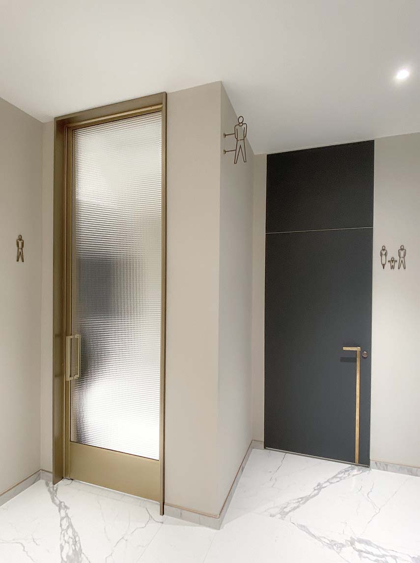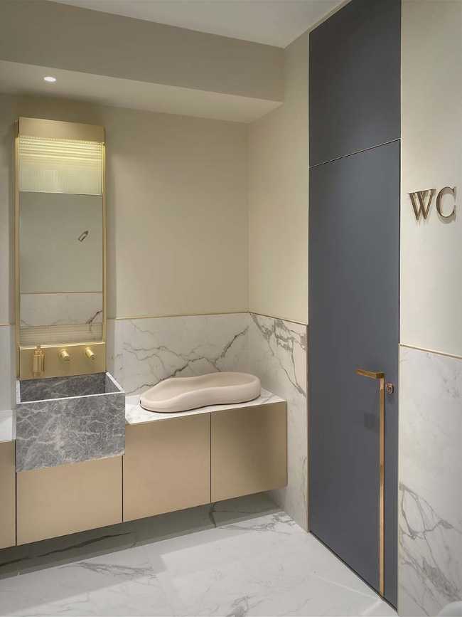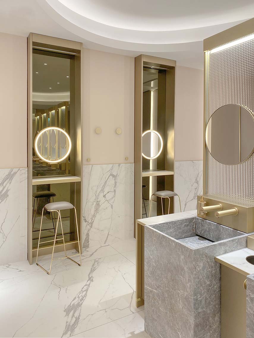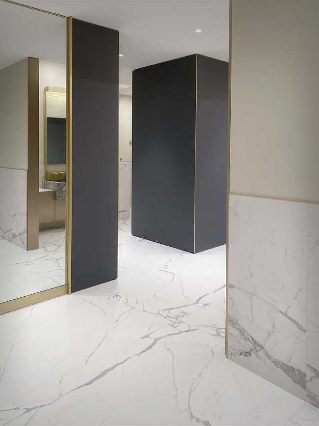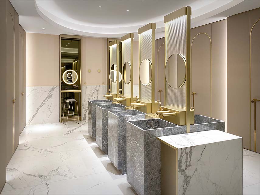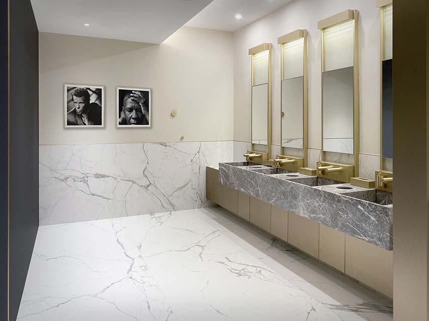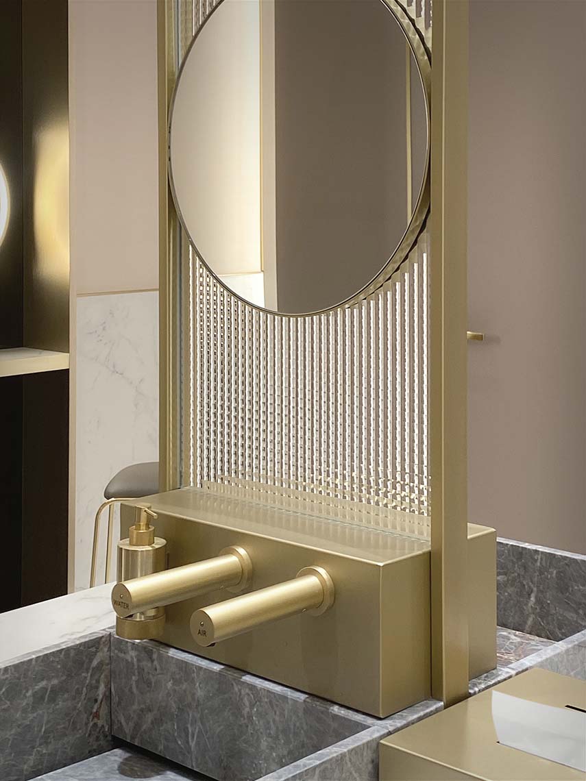 Marmo, ottone e vetro stampato sono accostati a materiali contemporanei come laminati soft-touch e a sistemi tecnologicamente avanzati, quali rubinetterie e asciugamani elettronici.
