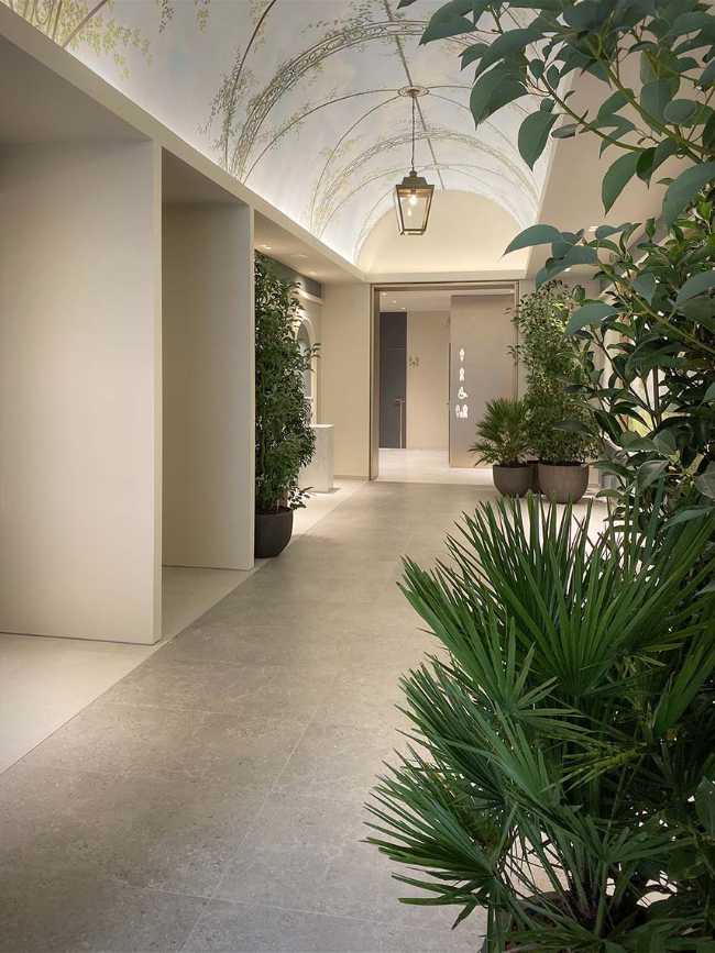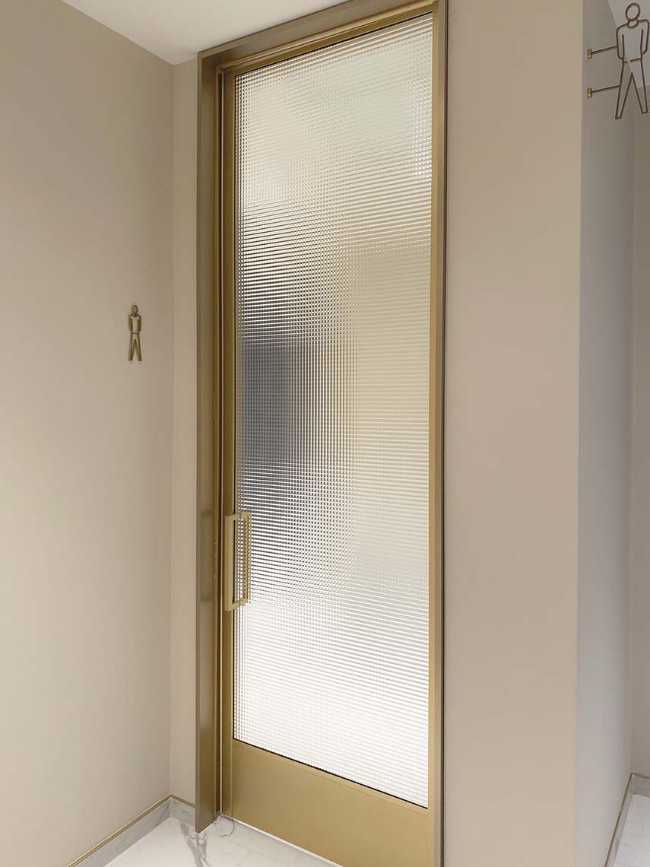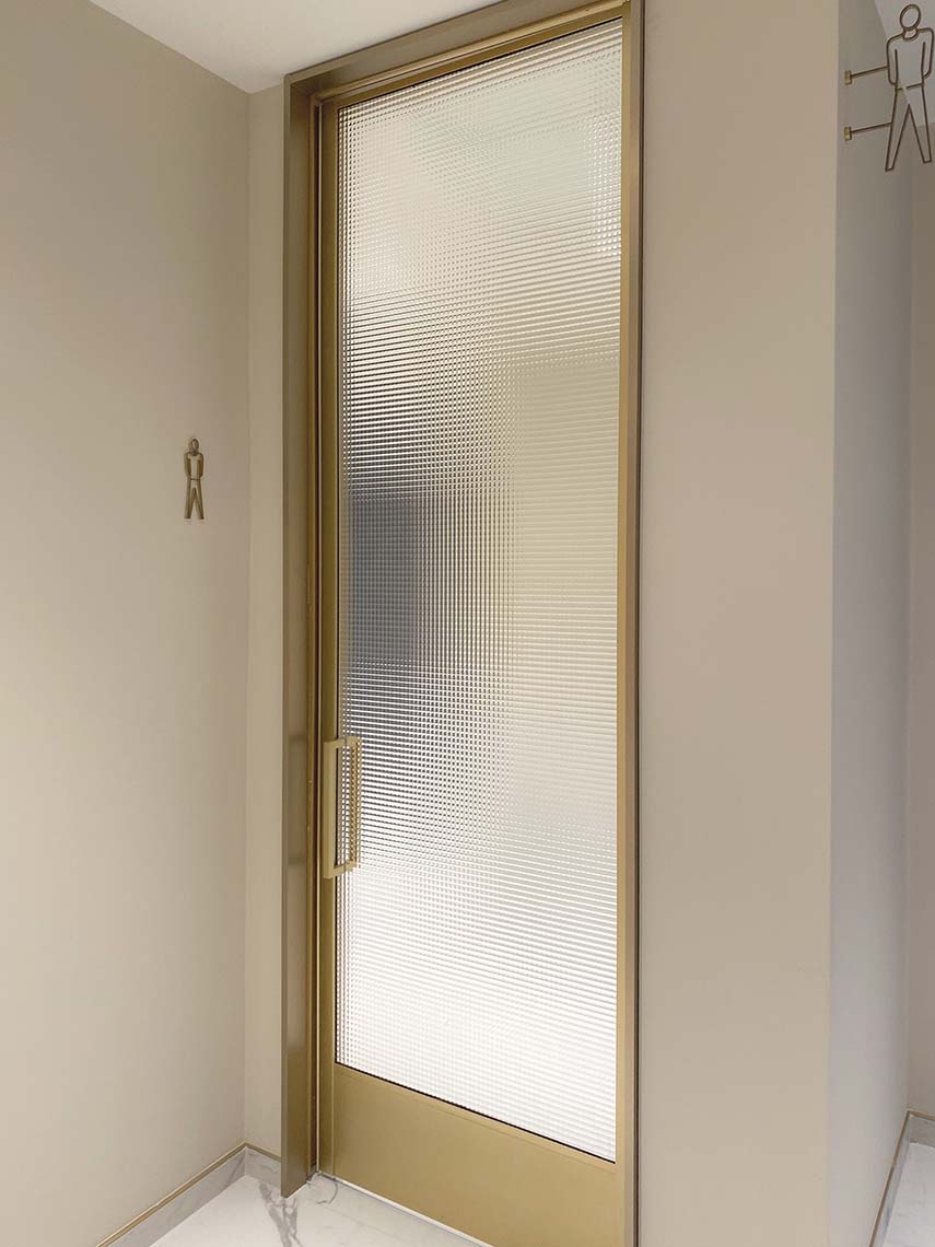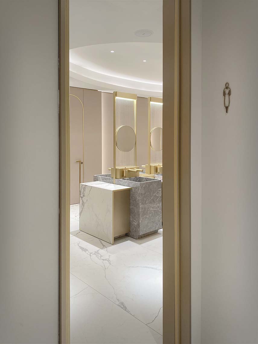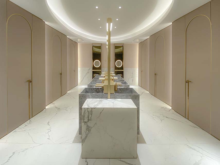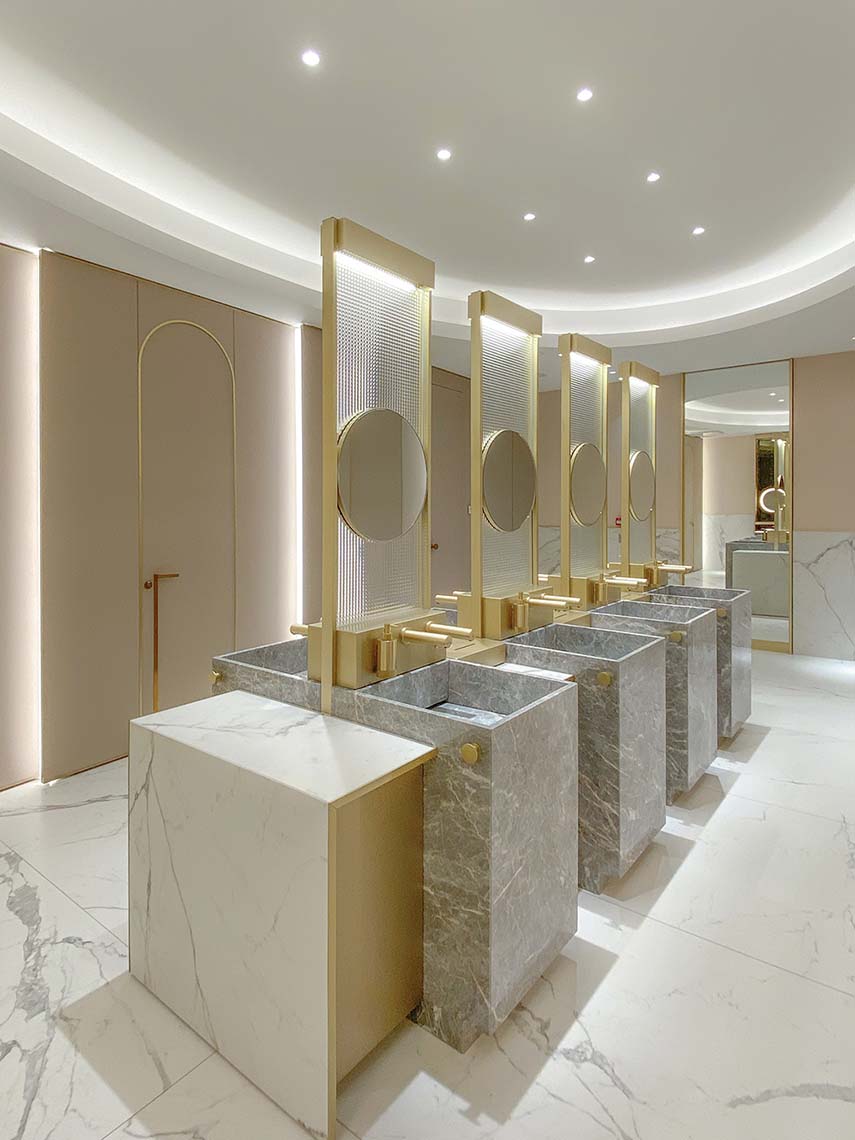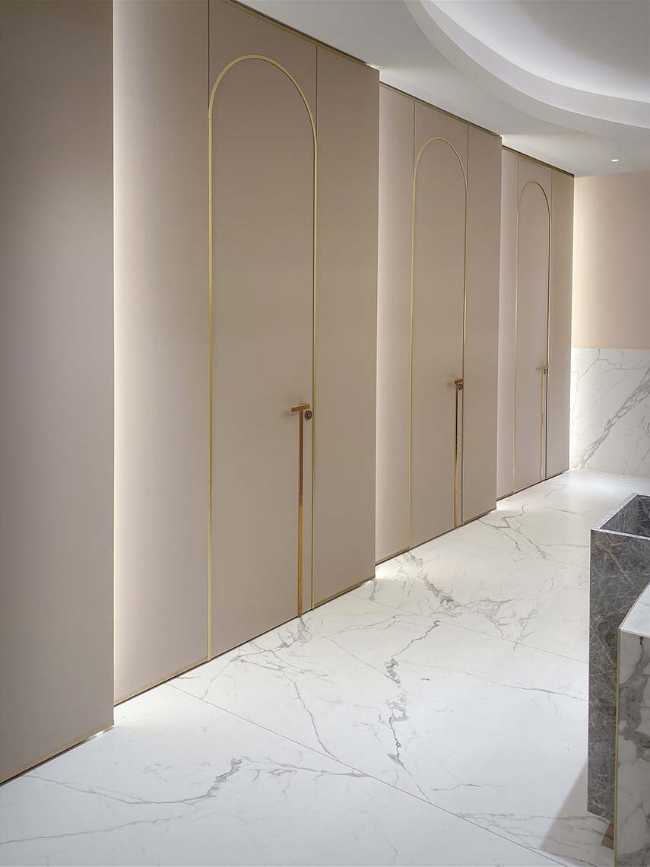 Marmo, ottone e vetro stampato sono accostati a materiali contemporanei come laminati soft-touch e a sistemi tecnologicamente avanzati, quali rubinetterie e asciugamani elettronici.