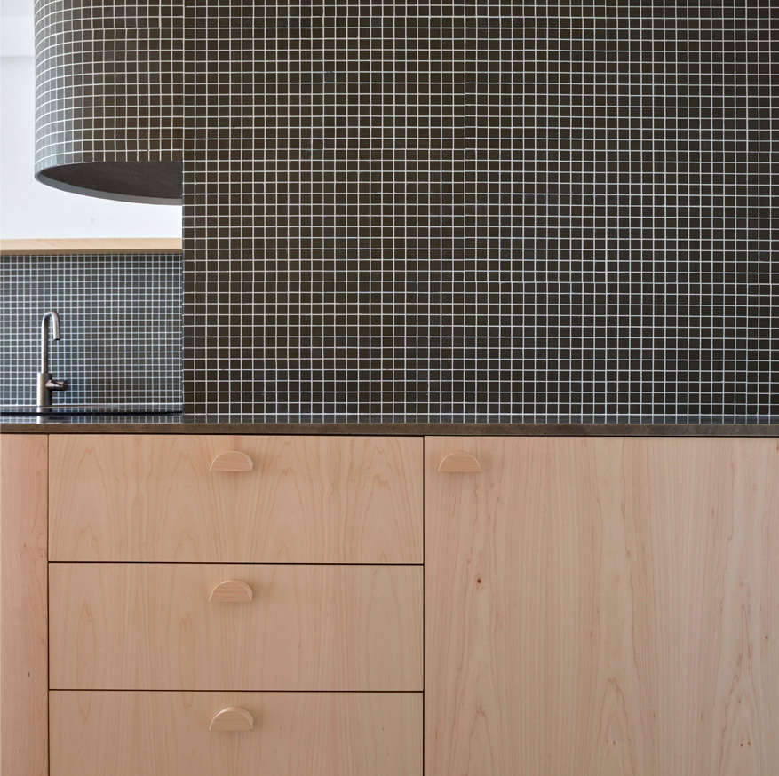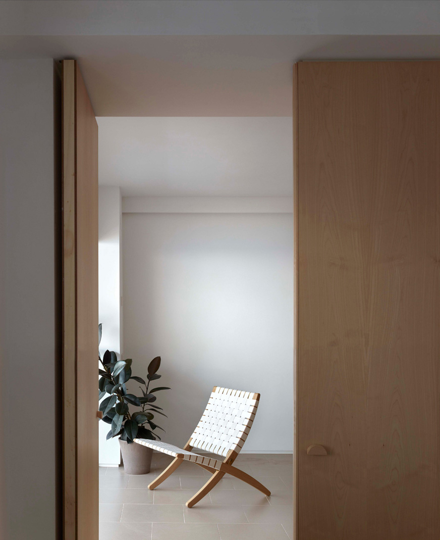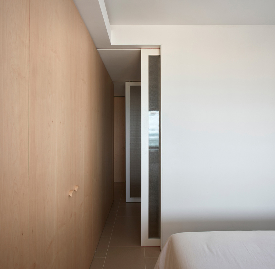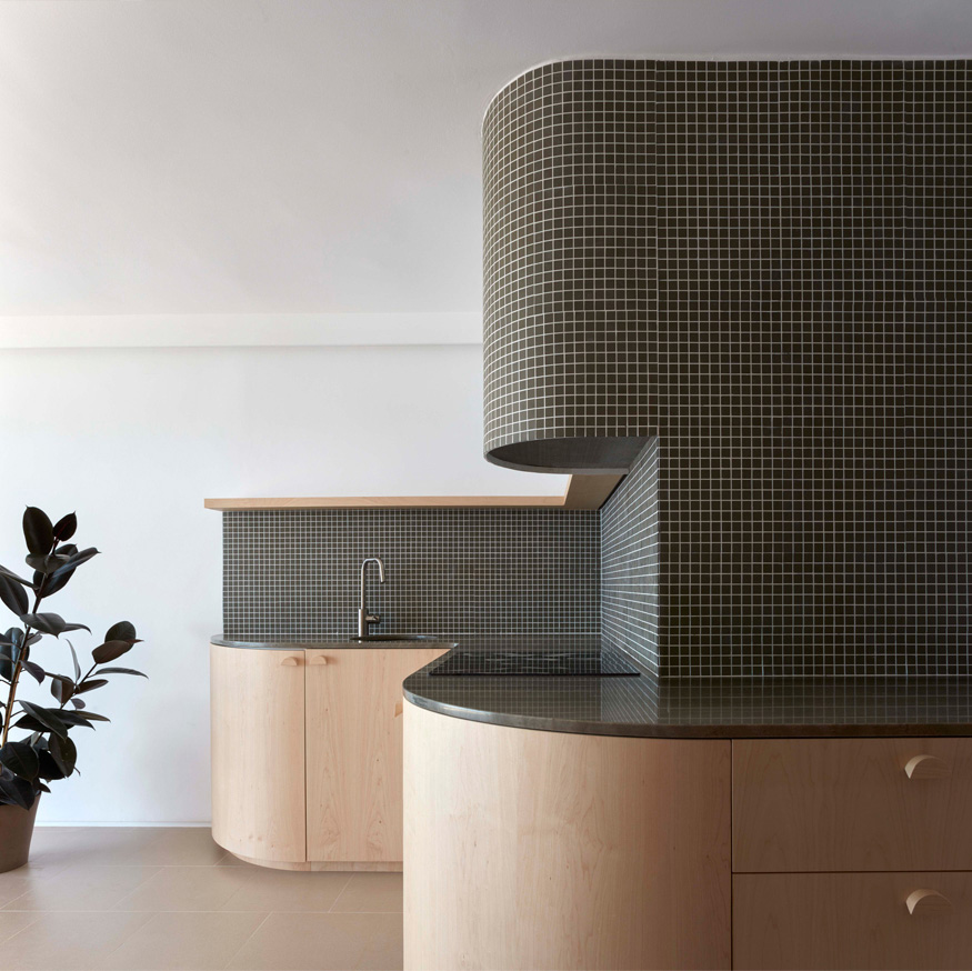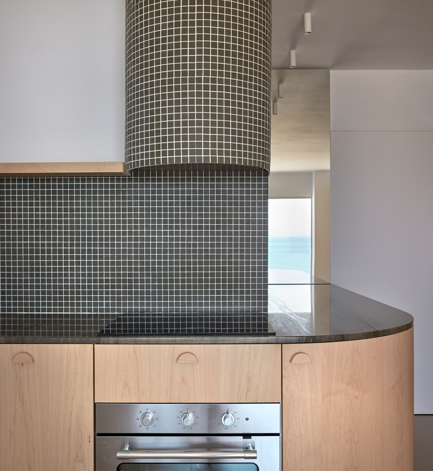Scompare il concetto di tramezzo per lasciar posto ai soli mobili che fungono da divisori degli spazi. Le geometrie curve definiscono la maggior parte degli elementi, creando movimento e fluidità invece di pause e spigoli. Il materiale protagonista della ristrutturazione è il legno di acero, assieme alla pietra naturale. Una serie di piastrelle continue rivestono lo spazio, conferendogli un carattere unico