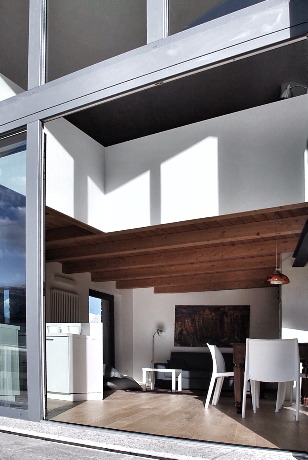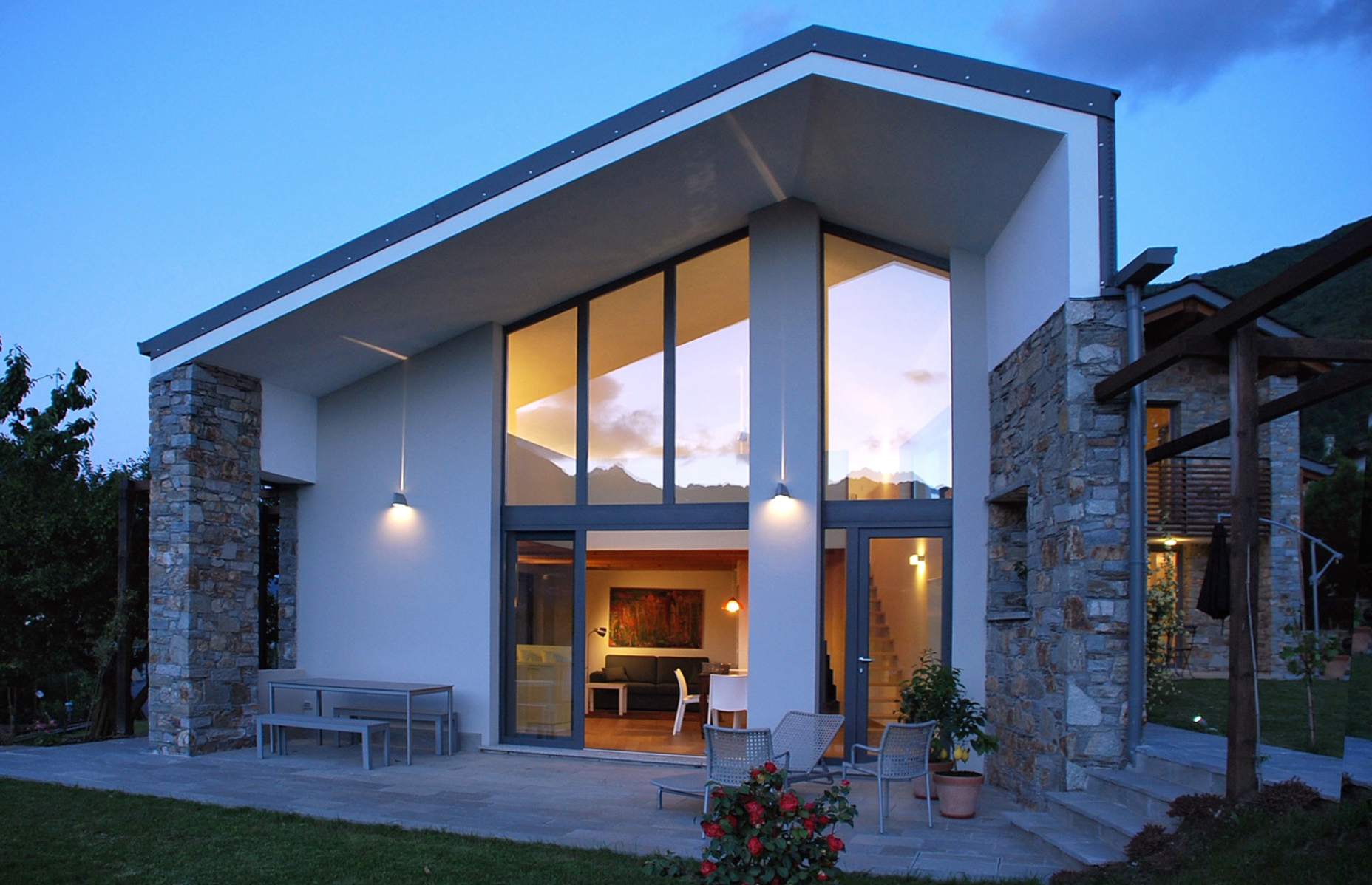Forme pulite vestite da materiali tecnici quali vetro e alluminio, vengono enfatizzate da una copertura che diventa "vela sospesa". Così Altrostudio Architetti ha reinterpretato lo spazio circostante creando due appartamenti indipendenti ma complementari