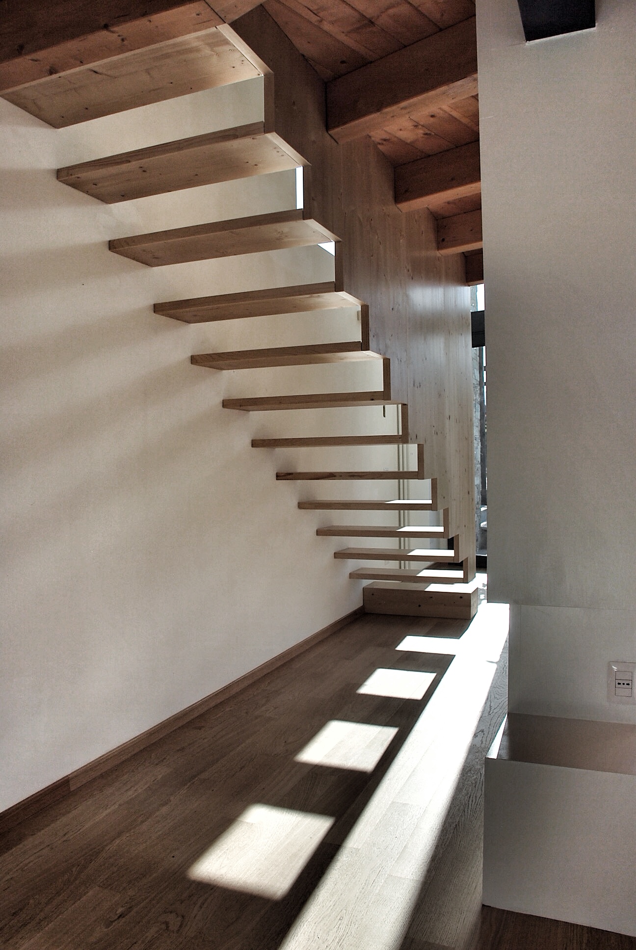 Gli arredi sono integrati il più possibile con gli elementi strutturali, come nel caso del pilastro rivestito da pannelli in legno che diventano armadio a vani chiusi e a giorno, nonché alla valorizzazione di alcuni particolari estetici come le rampe di scale che, con il loro disegno e fissaggio sospeso, paiono galleggiare senza agganci a terra