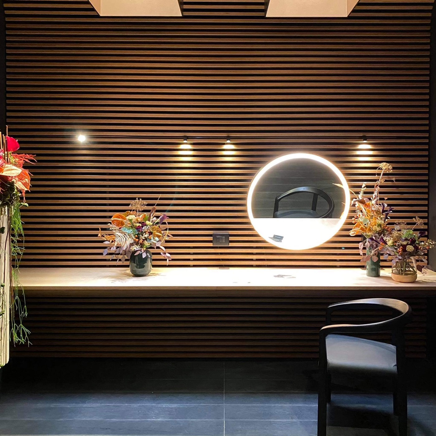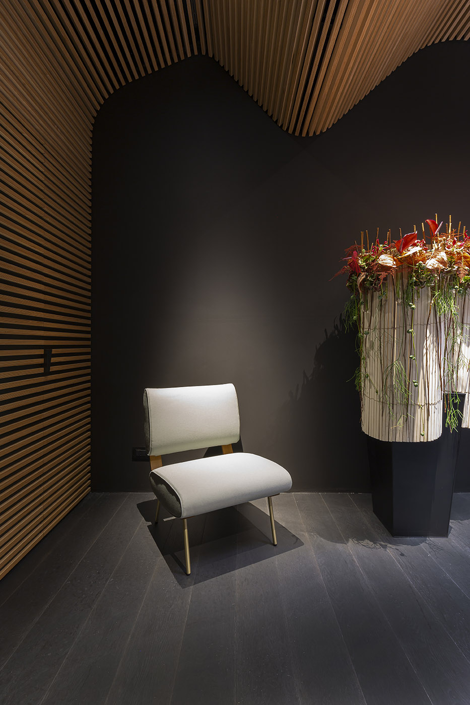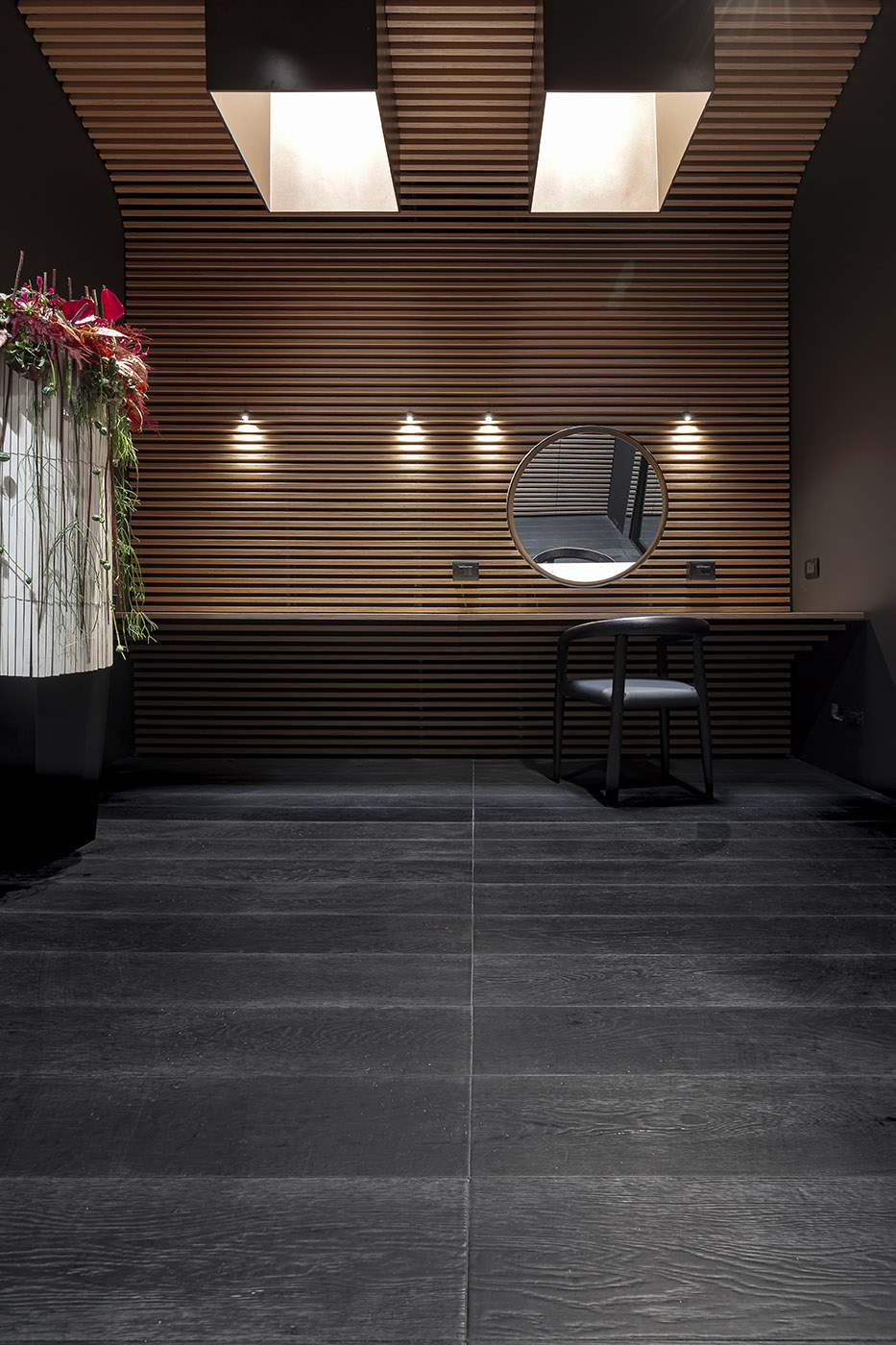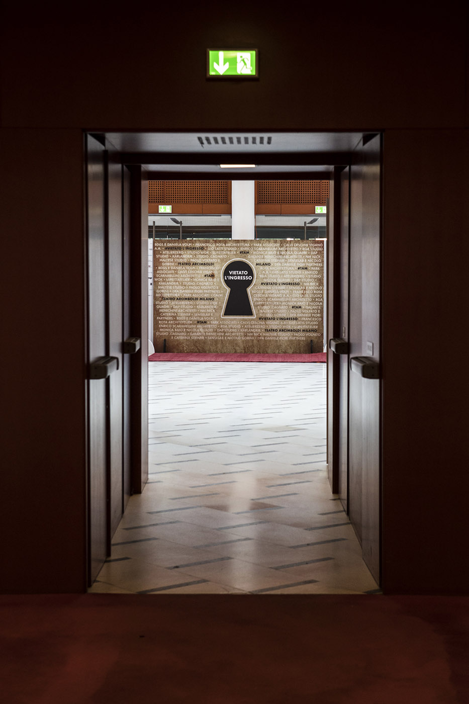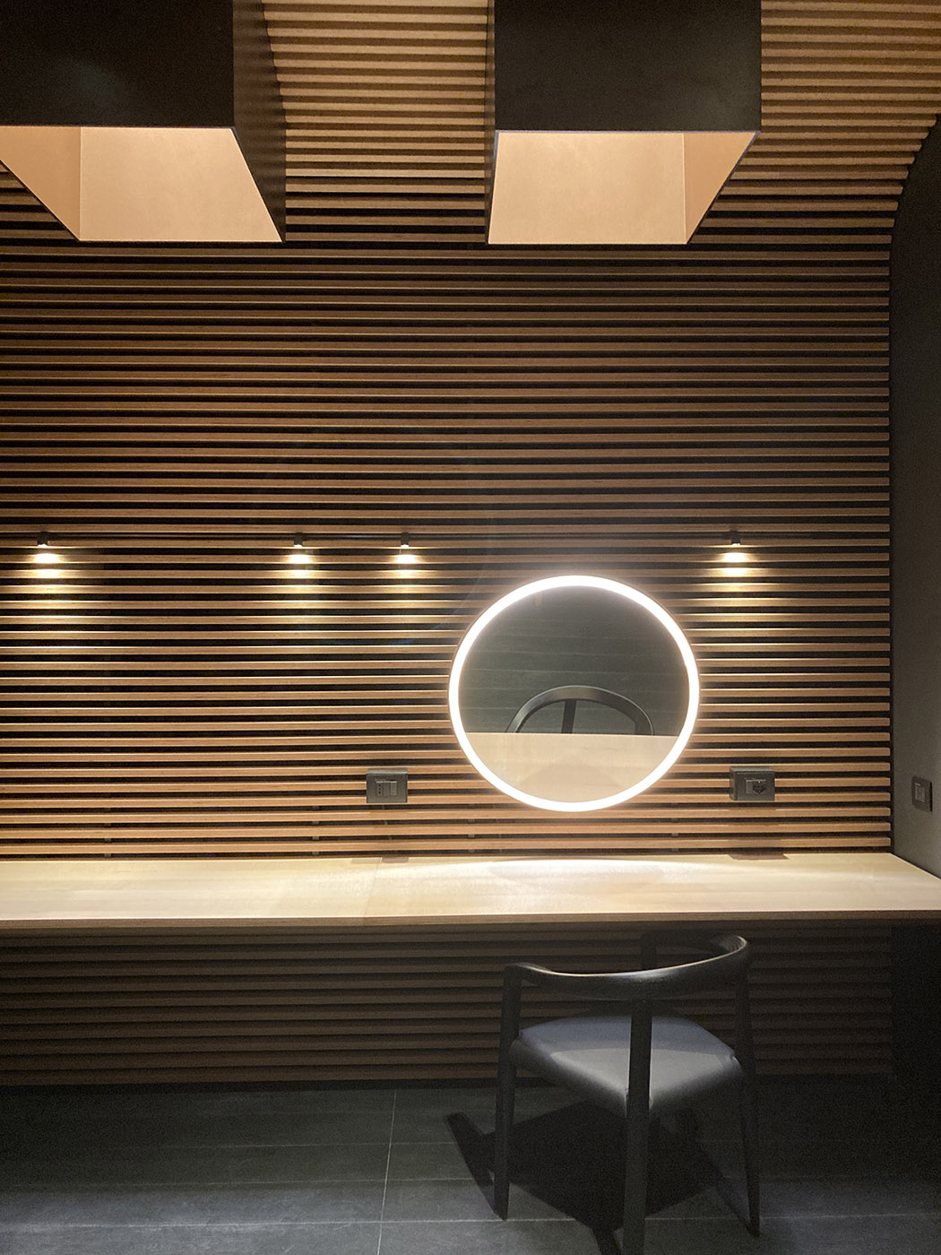 Pensato e realizzato con un approccio privo di decorazione ed allestimento, il camerino 16 ‘adottato’ dallo studio milanese si inserisce con delicatezza e rispetto nell’architettura forte e rigorosa di Gregotti. Ne è nato un luogo immersivo e raffinato, caratterizzato da un involucro in legno che, dalle pareti d’ingresso, si svolge e ‘srotola’ come una morbida onda sul soffitto, sino a ricoprire la parete della zona trucco