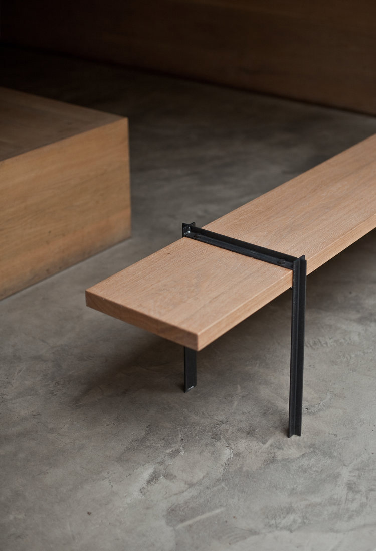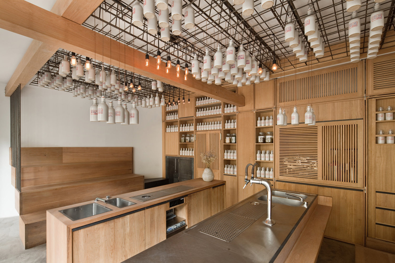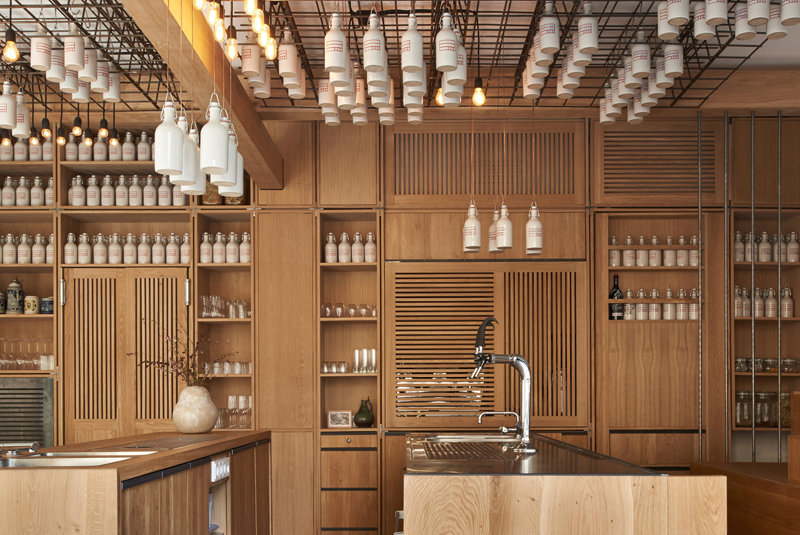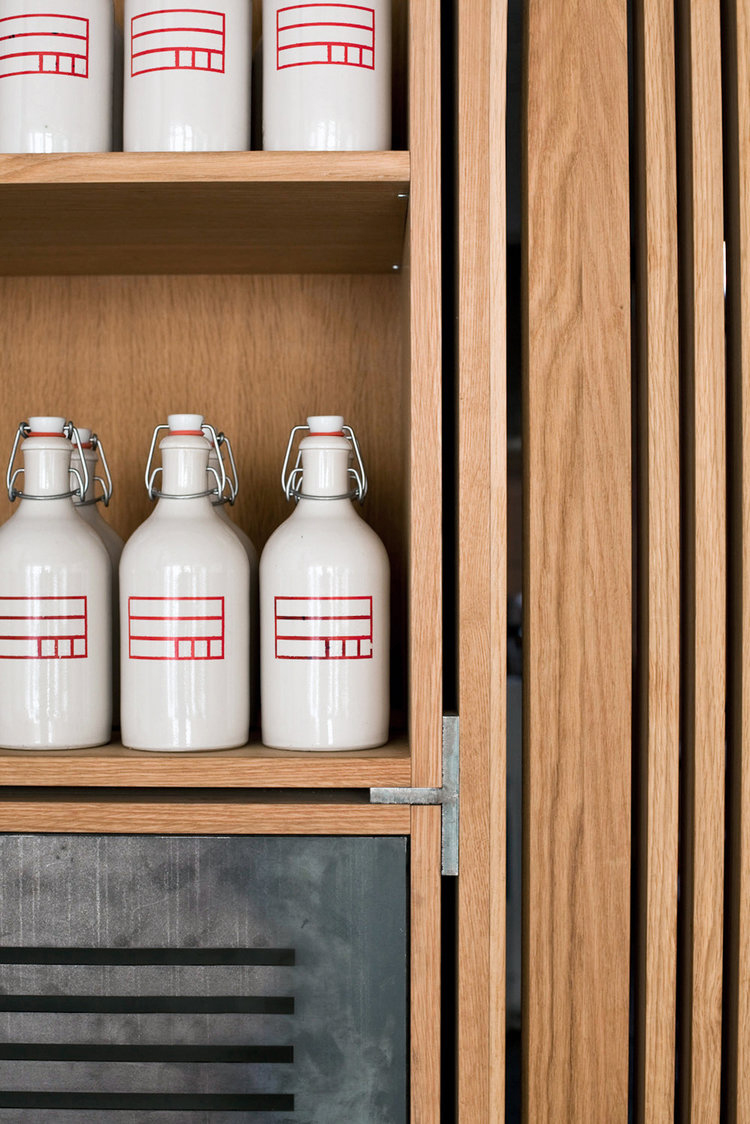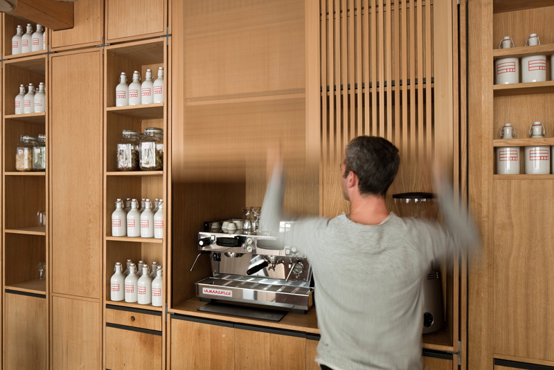 Ad integrarsi con l'ambiente sono anche la macchina del caffè, le porte dei bagni e quelle del retro. Bar e armadi sono in massello di rovere con finitura ad olio naturale. Su una rete in acciaio nera sono sospese bottiglie di ceramica attaccate al soffitto, con liquori, sciroppi e varie essenze. Molte delle soluzioni all'interno del bar sono soluzioni su misura, realizzate da falegnami e produttori locali