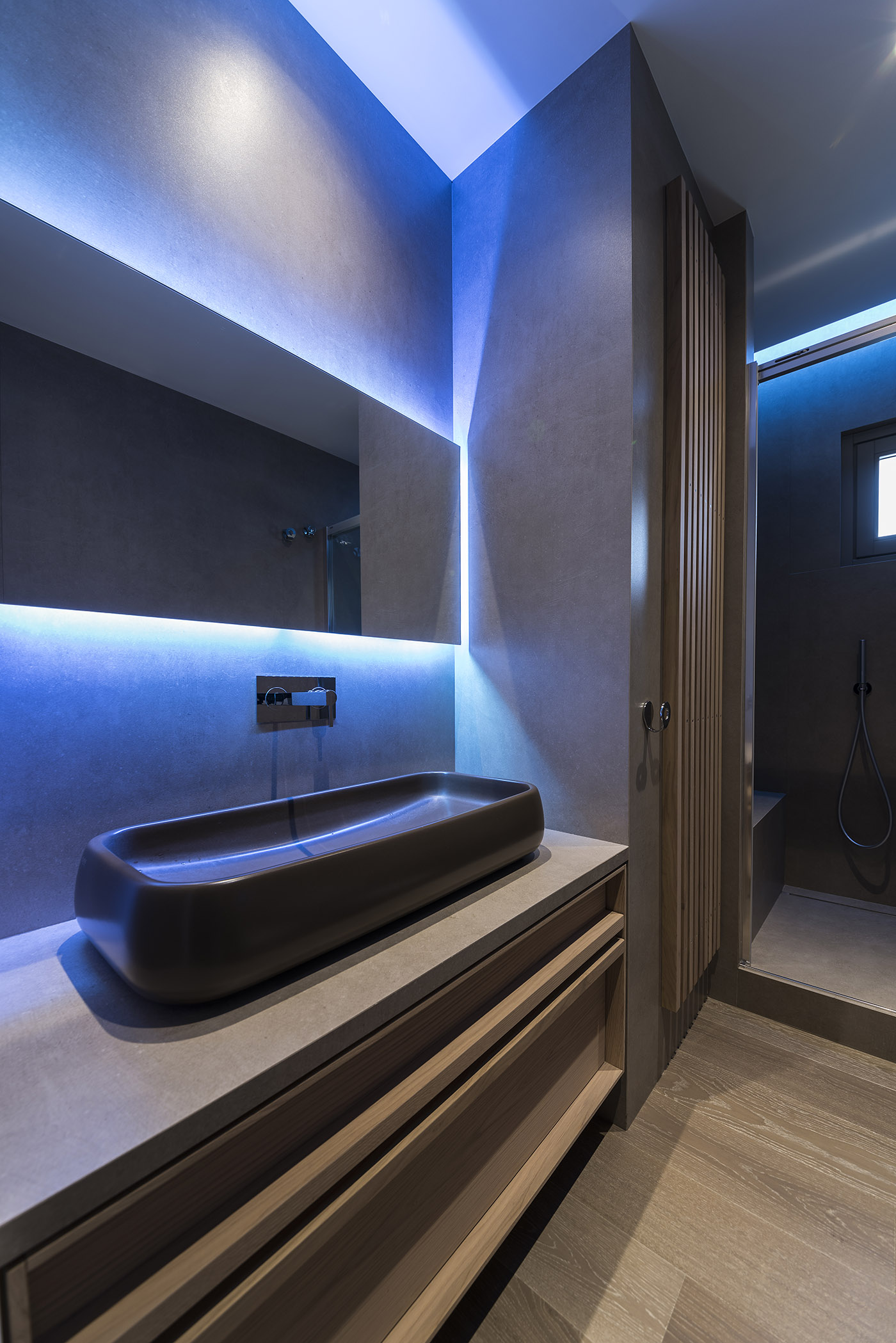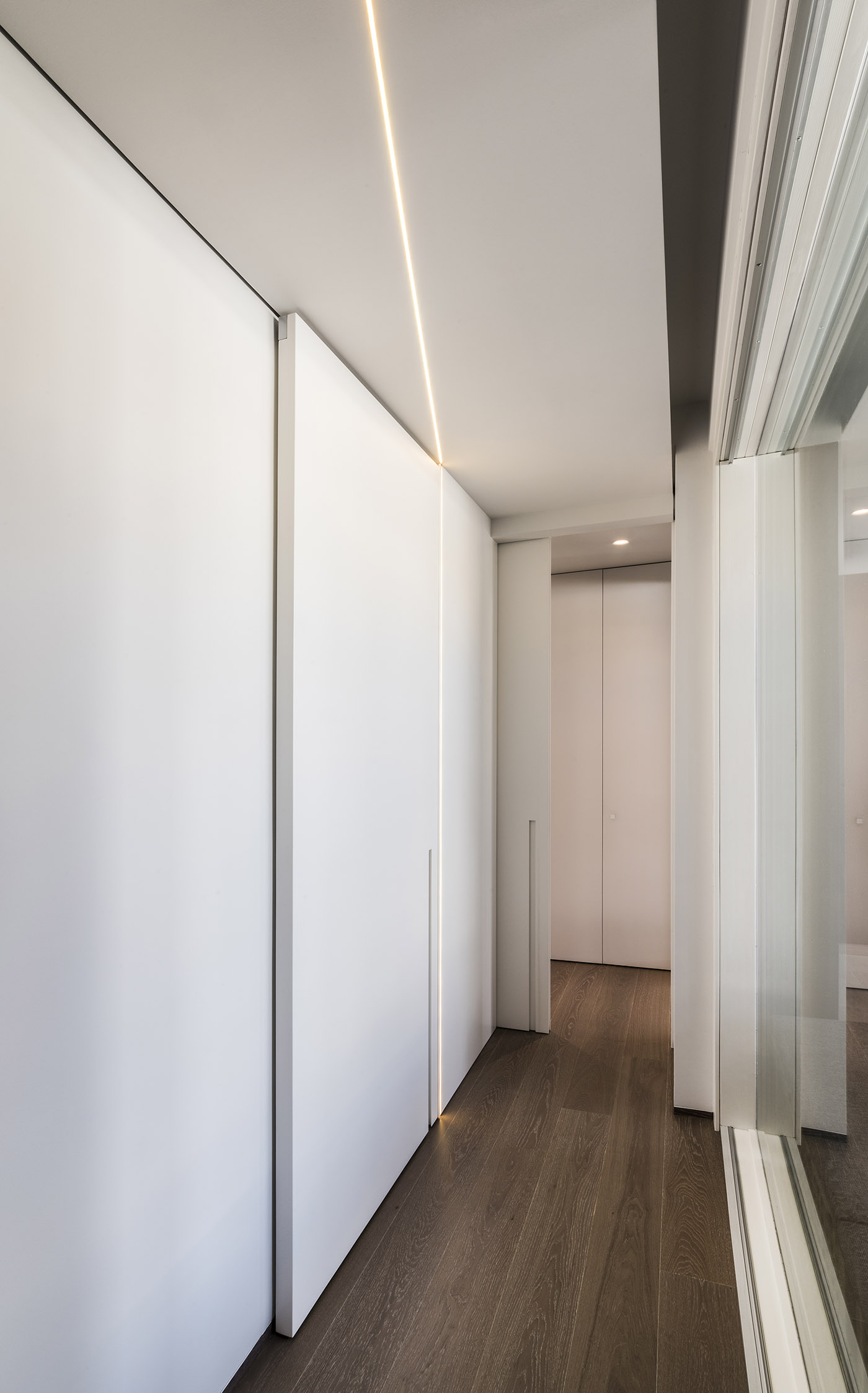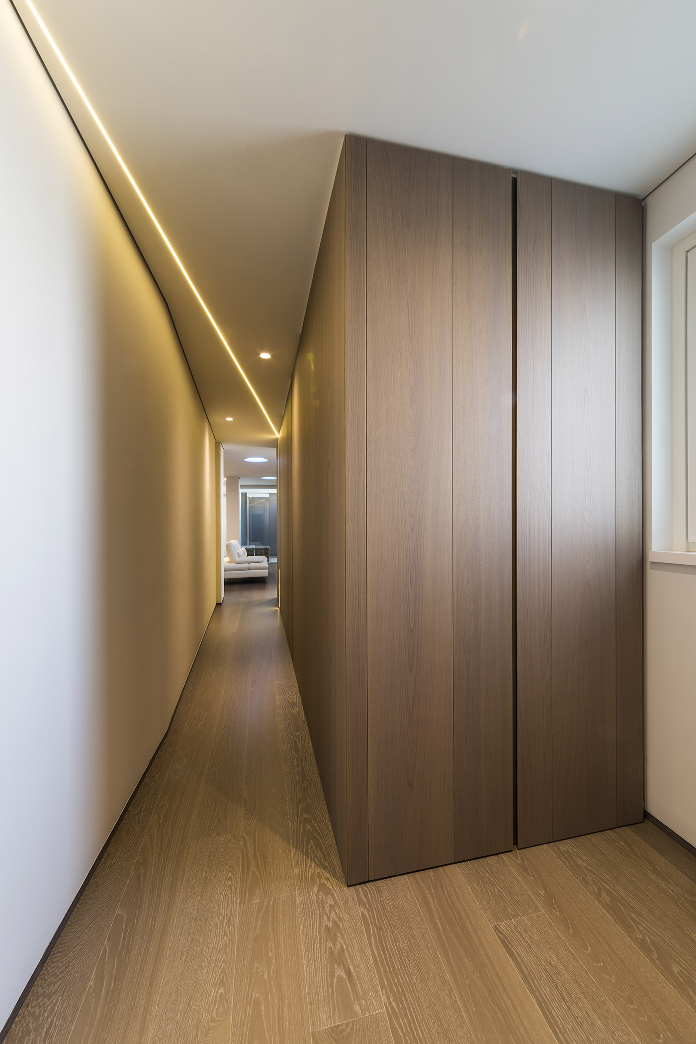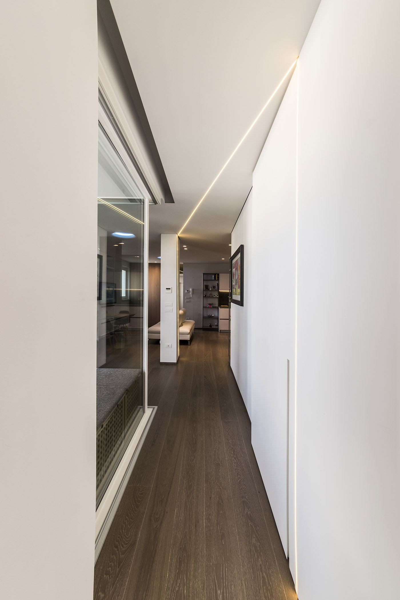 La luce è la protagonista di questi interni che vedono valorizzati anche spazi spesso trascurati, come il corridoio che qui diventa uno spazio dinamico e dal grande impatto scenografico: da un lato una parete in cartongesso ad andamento non lineare cela i pilastri, dall’altro una boiserie in cui sono integrate porte e lame di luce fornisce in modo originale spazi di servizio quali guardaroba, bagno ospiti, lavanderia, vano tecnico per caldaia e stireria