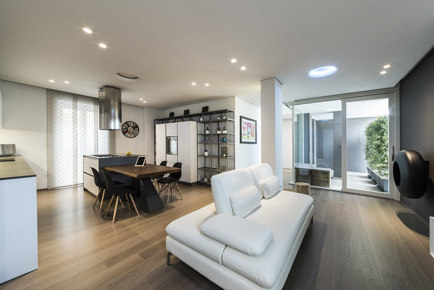 Gli spazi della zona giorno sono fluidi e fortemente connessi in un ampio open space in cui la luce invade ogni angolo grazie ad una vetrata angolare che si affaccia sul terrazzino, il cuore della casa: ecco il giardino d'inverno con le sedute in vimini e le piante che proteggono dall'esterno, garantendo la privacy e la modulazione della luce. Su di esso si affaccia anche la zona notte, valorizzata dalle porte scorrevoli bianche a tutta altezza e da armadiature a filo muro