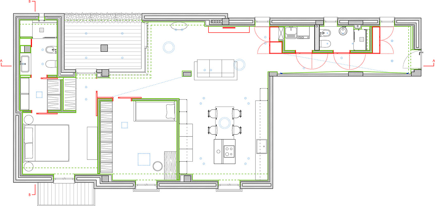 Un appartamento anni ’70 trova nuova vitalità grazie all’intervento di ottimizzazione energetica e all’enfatizzazione dinamica dello spazio attorno al nuovo cuore della casa: il giardino d’inverno
