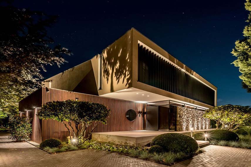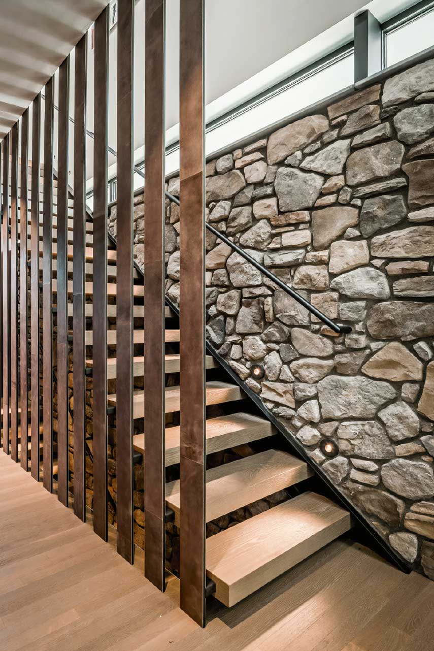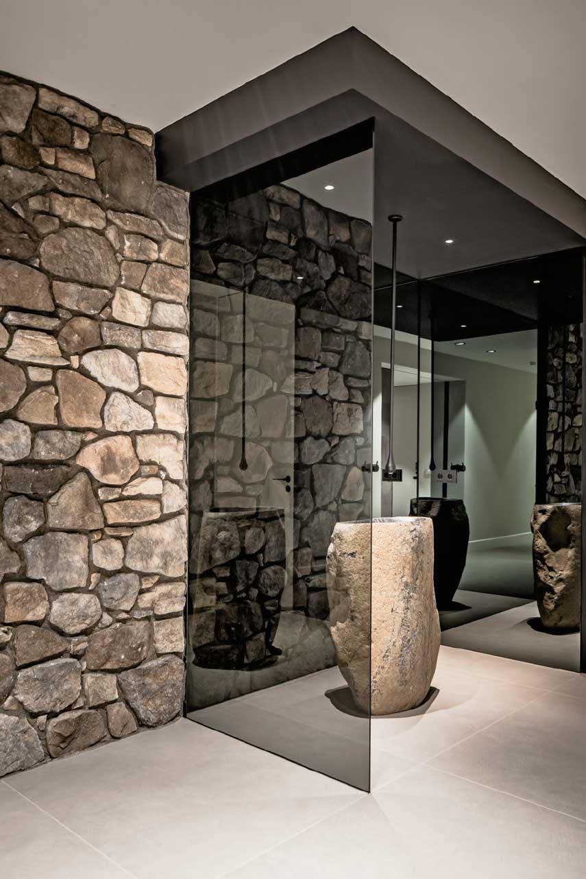 Il design specifico in Geopietra® decora la facciata esterna, riflettendo la luce delle piscine, e continua all'interno, accompagnando la scalinata e facendo capolino in diverse zone, come camini e camere da letto. Materiali di lusso come il legno wengé, l'acciaio robusto, la pelle e i marmi contribuiscono a creare un'atmosfera magnifica e distintiva nella villa.