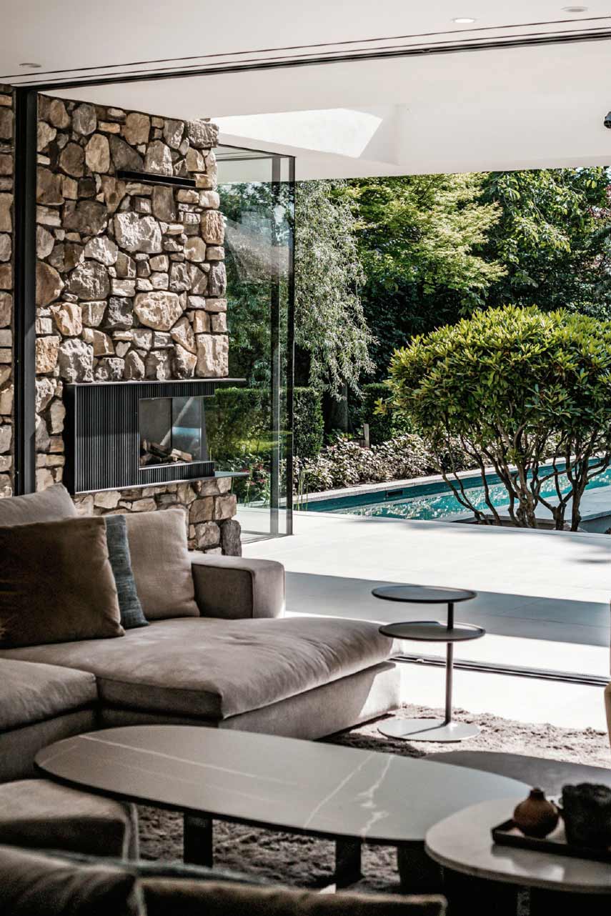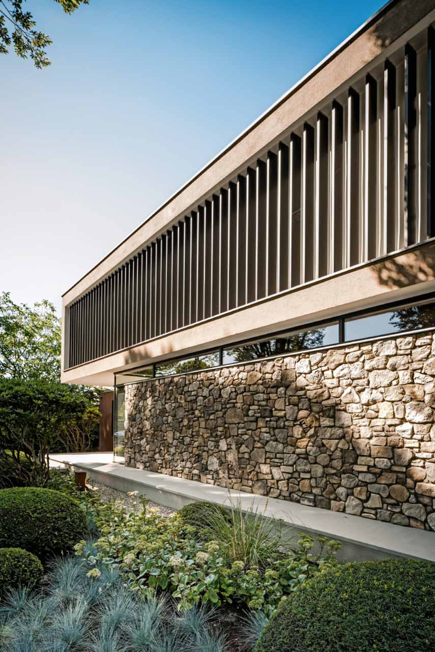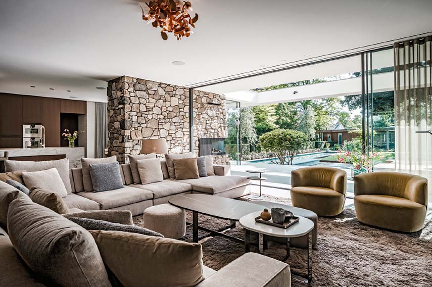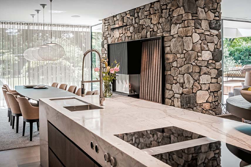 La maestria di François Hannes nell'architettura degli interni si concentra sulla profondità visiva, la luce e l'organizzazione degli spazi. Al contrario, Tom Kneepkens ha reinventato l'esterno basandosi sulle esigenze di chi vivrà in quella villa, creando una simbiosi perfetta con l'interno. Uno degli aspetti salienti è il rivestimento in pietra Geopietra®, personalizzato per soddisfare le esigenze del cliente, mescolando tonalità calde e fredde.