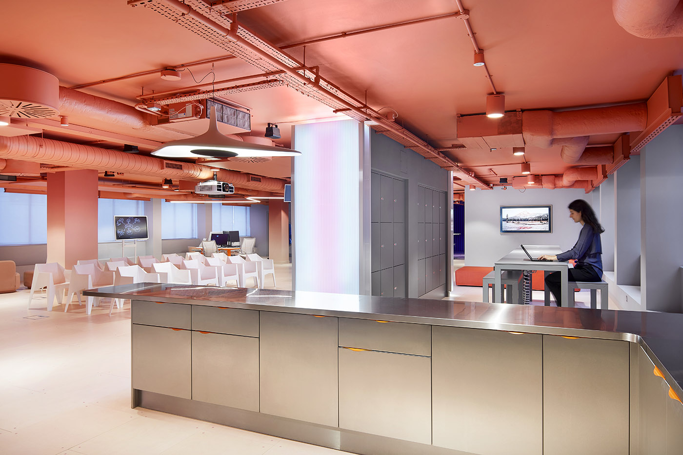 Lo spazio è incentrato sulla collaborazione open-plan. Offre ad ambienti per lavorare si trovano spazi per creare eventi e presentazioni. Una parete tech integrata avvolge lo spazio interno e visualizza senza soluzione di continuità i contenuti IT quando necessario