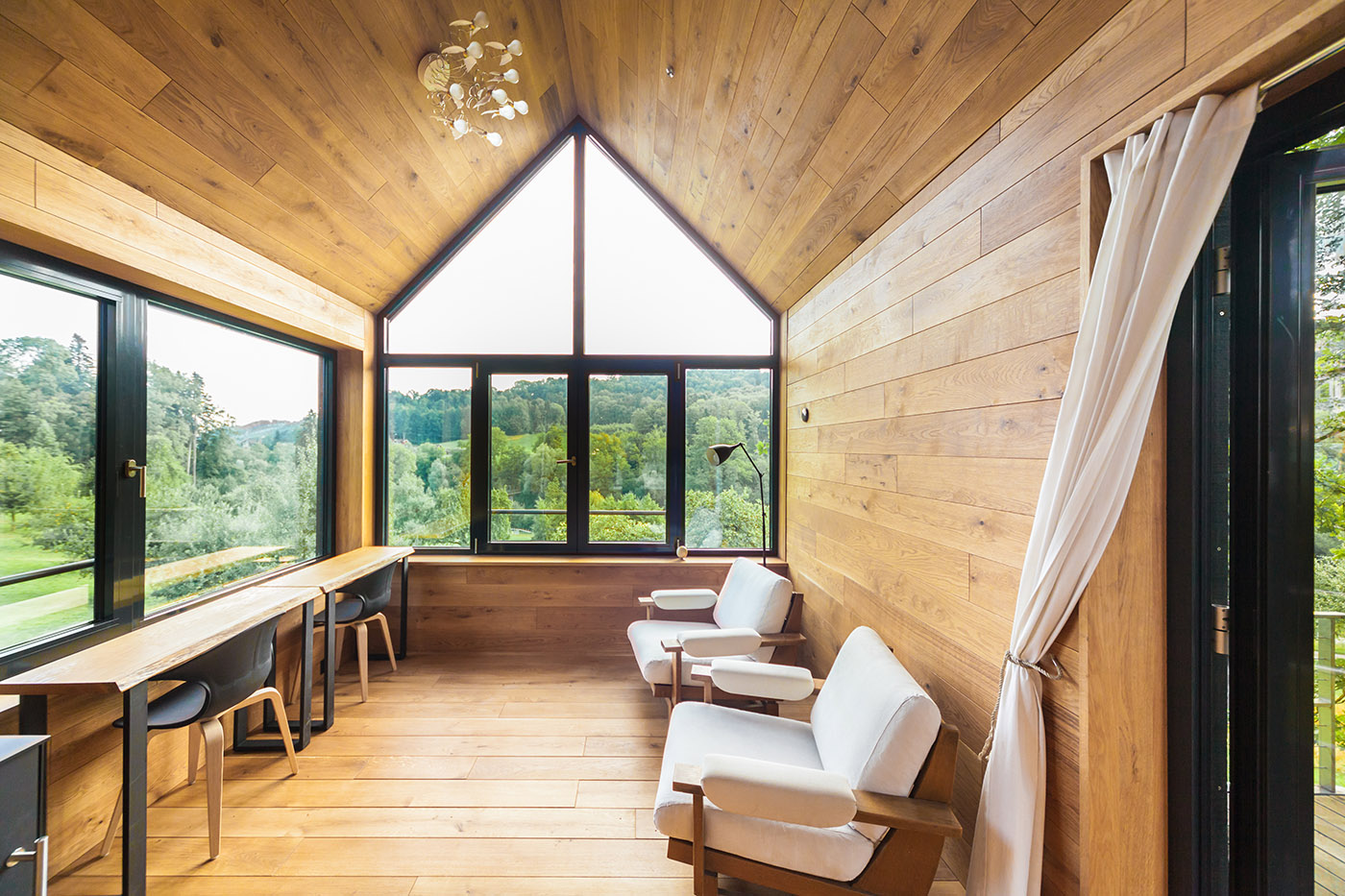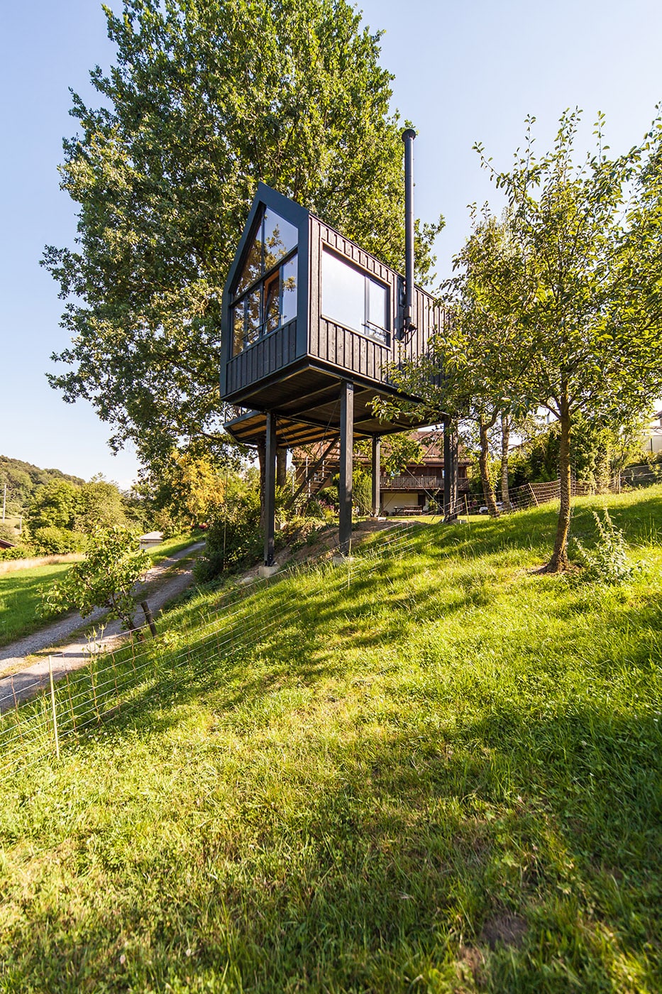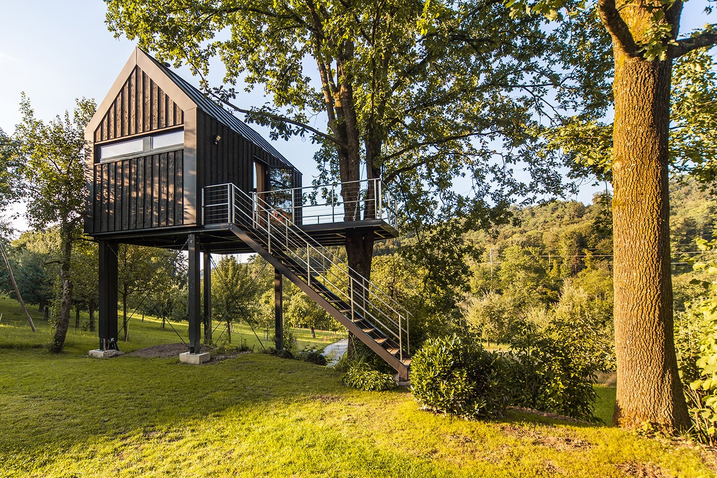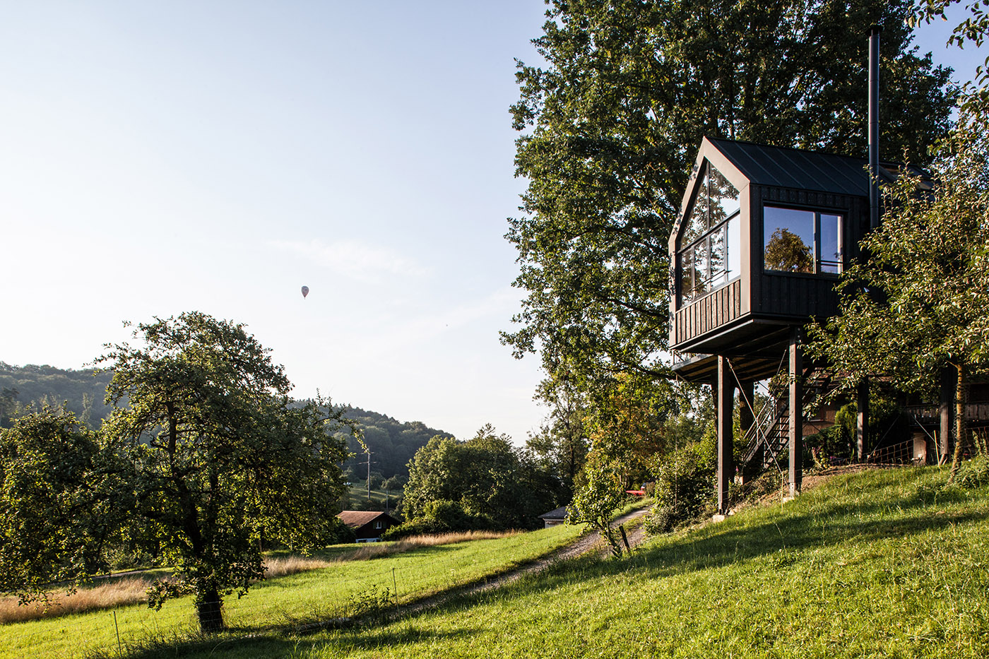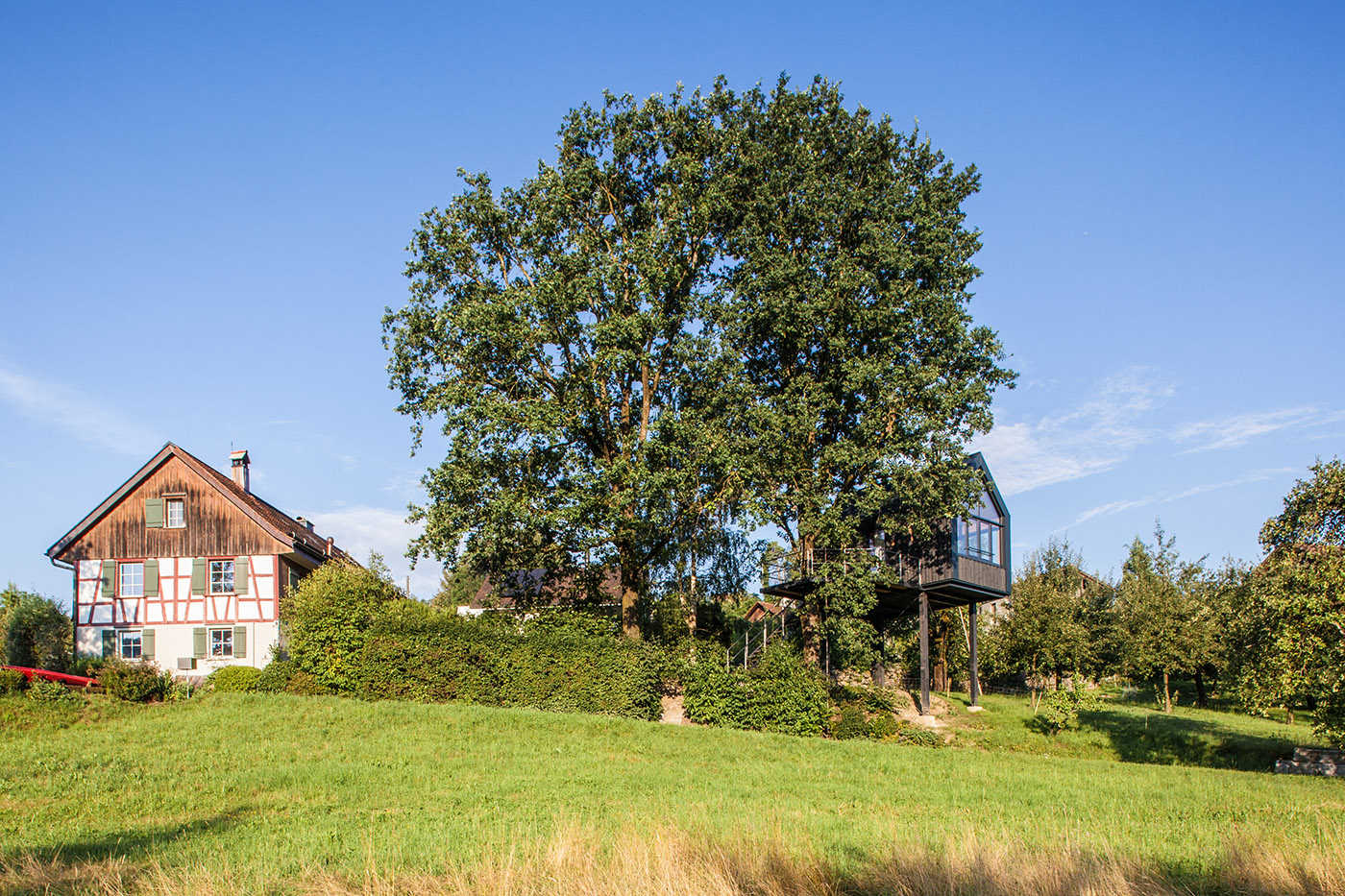 Il sito in cui sorge la casa, progettata da Baumraum Studio, si trova in una piccola valle, vicino al Lago Costanza, pieno di bellissimi alberi di quercia. Un luogo che fornisce le condizioni ideali per per la realizzazione di progetti di architettura come questo. Nonostante la forma tradizionale a doppia falda, grazie alle ampie superfici vetrate, i dettagli ed il design dell'involucro esterno, dal colore scuro, l'architettura è moderna.