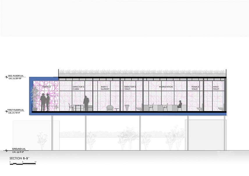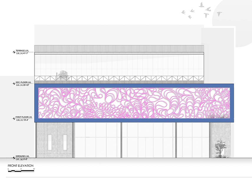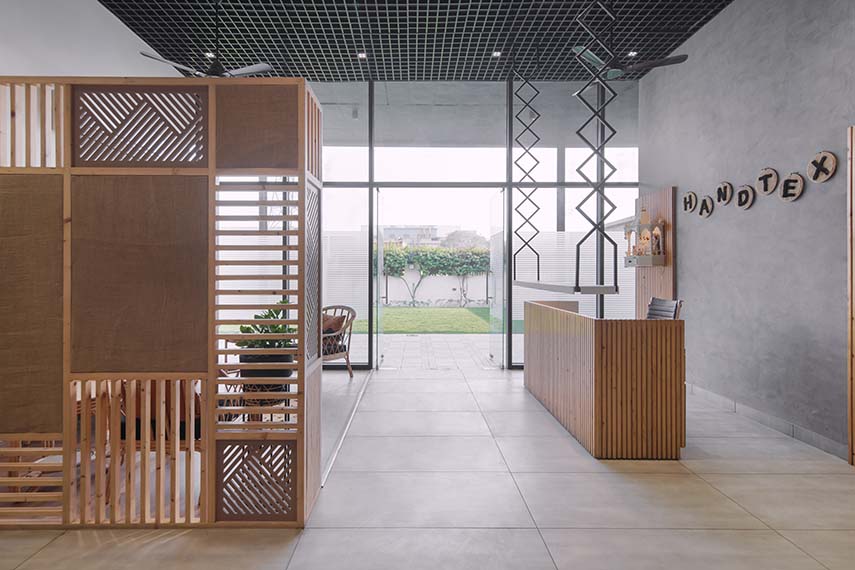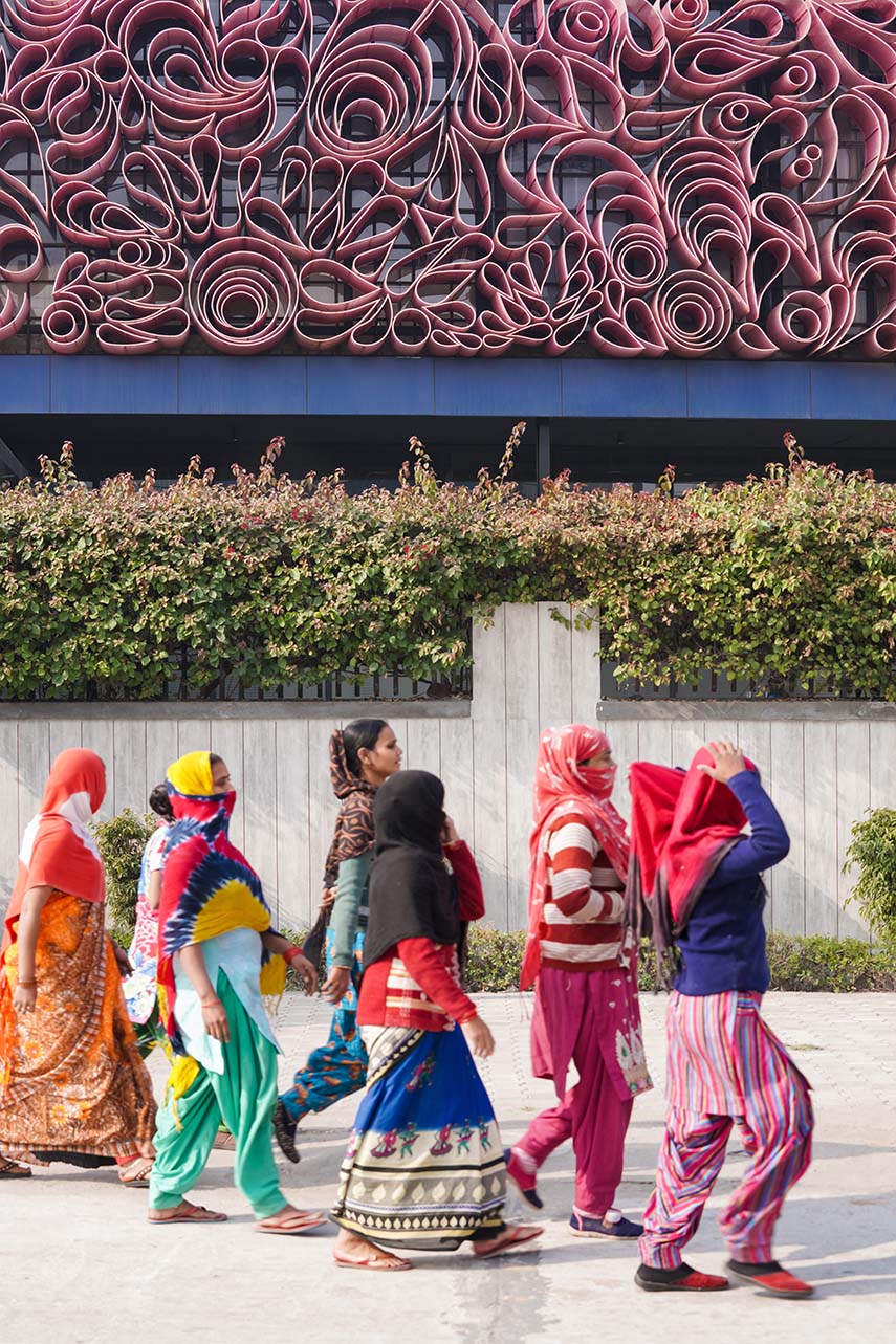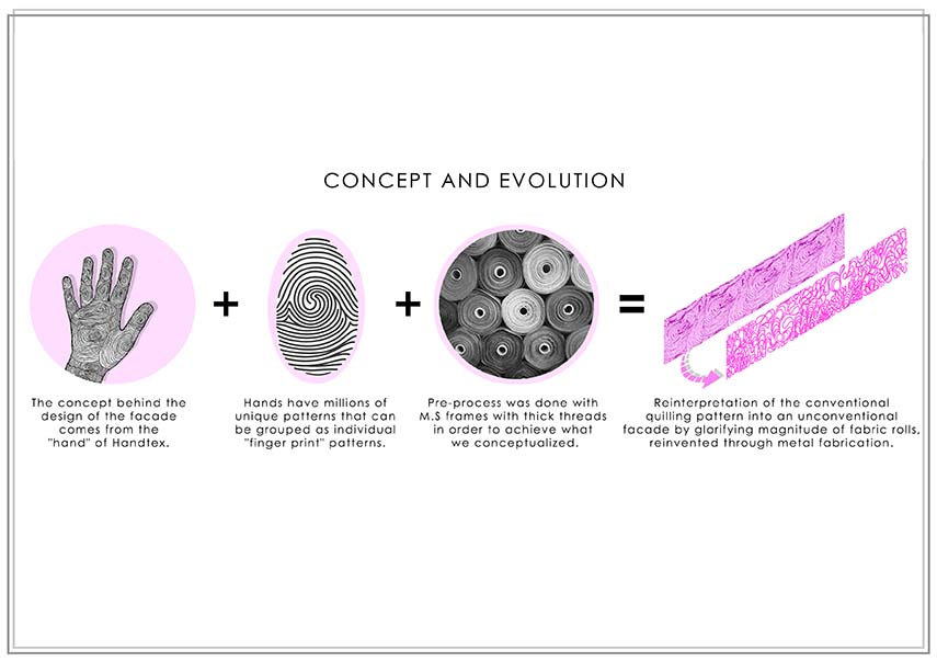 L’elemento più riconoscibile dell’edificio, progettato da Studio AVT Architects è la facciata iconica, sviluppata reinterpretando il quilling pattern in chiave contemporanea. Le curve dei rotoli di tessuto diventano un’installazione di lamiere forate e piegate, sospese a distanza dal vetro, creando ombre dinamiche e riducendo il calore all’interno. Un gesto architettonico che non è semplice estetica, ma una dichiarazione d’identità per l’azienda, legata alla tradizione manifatturiera e al valore del lavoro manuale.