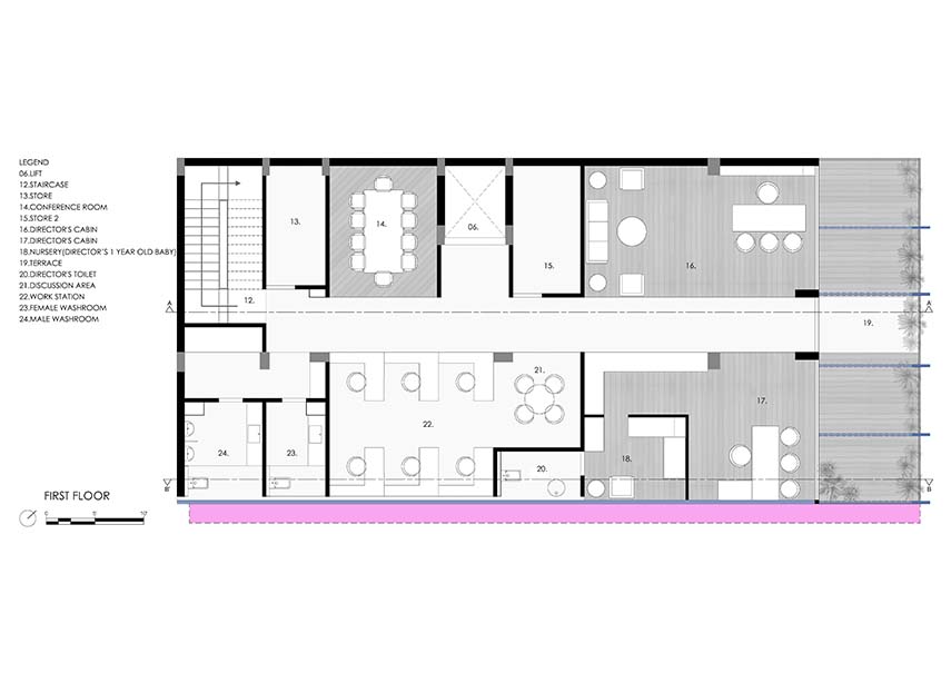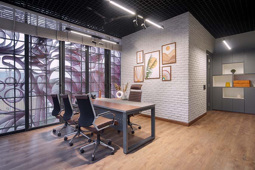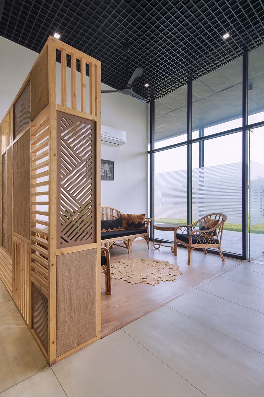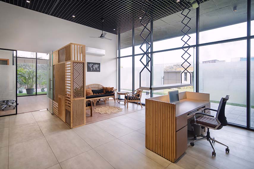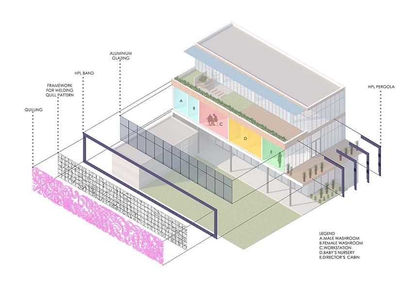 L’elemento più riconoscibile dell’edificio, progettato da Studio AVT Architects è la facciata iconica, sviluppata reinterpretando il quilling pattern in chiave contemporanea. Le curve dei rotoli di tessuto diventano un’installazione di lamiere forate e piegate, sospese a distanza dal vetro, creando ombre dinamiche e riducendo il calore all’interno. Un gesto architettonico che non è semplice estetica, ma una dichiarazione d’identità per l’azienda, legata alla tradizione manifatturiera e al valore del lavoro manuale.