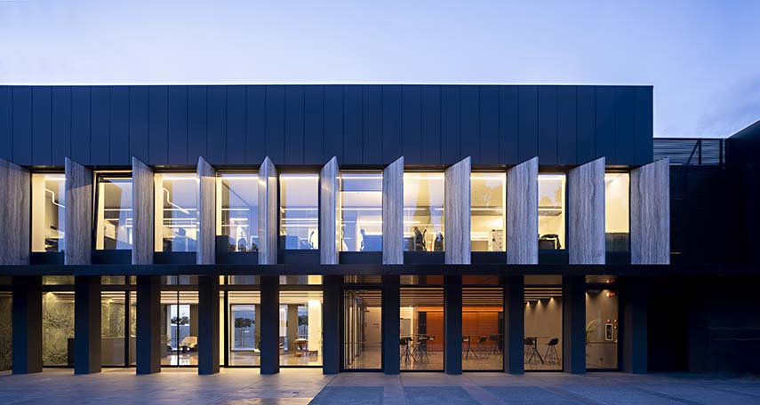 La nuova immagine di Capua1880 si completa e culmina nel progetto delle nuove facciate che, con un abbraccio formale, unisce senza uniformare e con un “grande gesto di ordine, dalla potente forza comunicativa” (GEZA Architettura) lo trasforma in un vero e proprio landmark. Una unica pelle sospesa vede l’alternarsi dei materiali di sfondo, tra basalto, alluminio, corten, marmo verde alpi e cemento, con i segni verticali dei frangisole in pietra, dei pilastri neri, delle lamiere dogate, dei vetri neri e dei pannelli in metallo microforato
