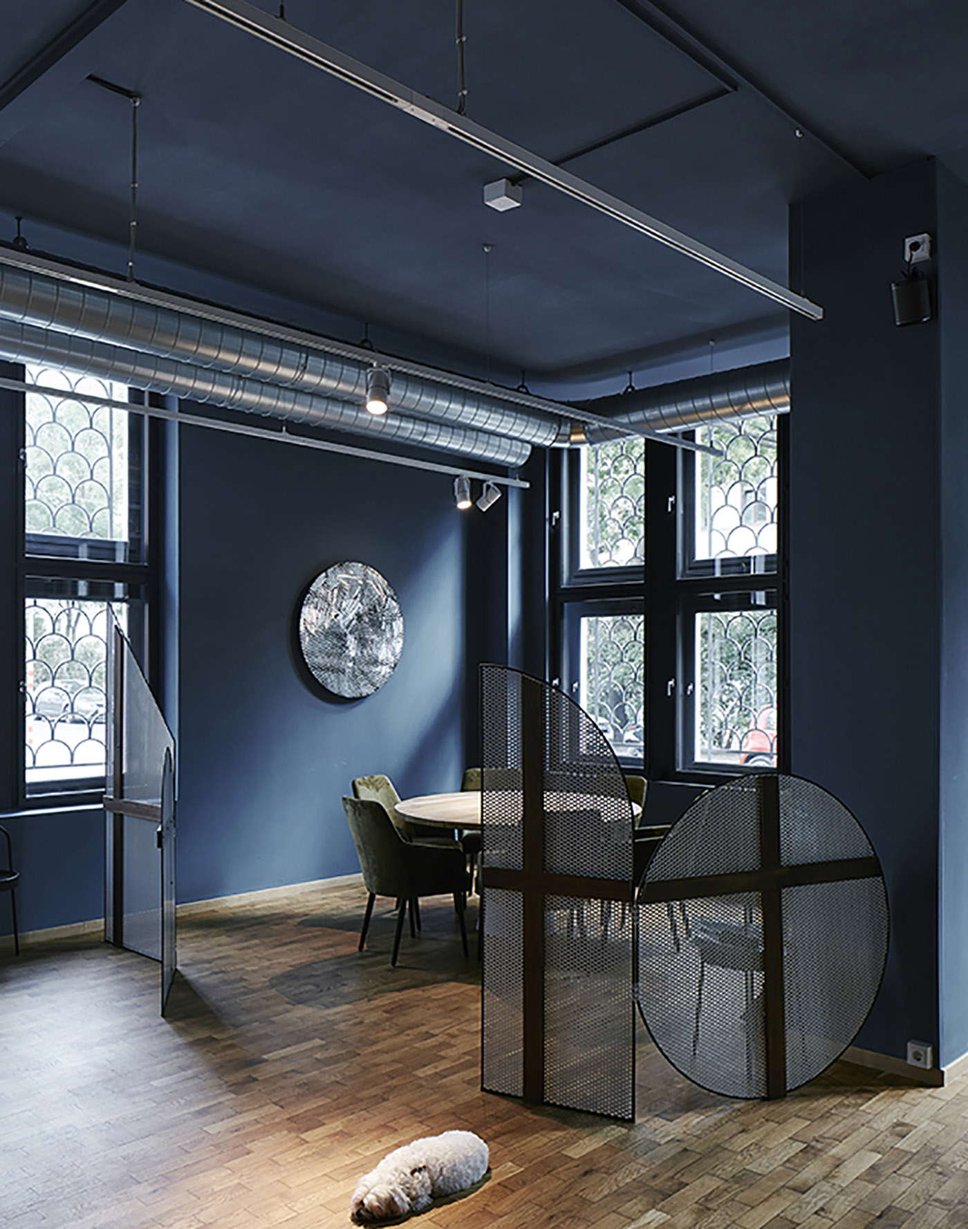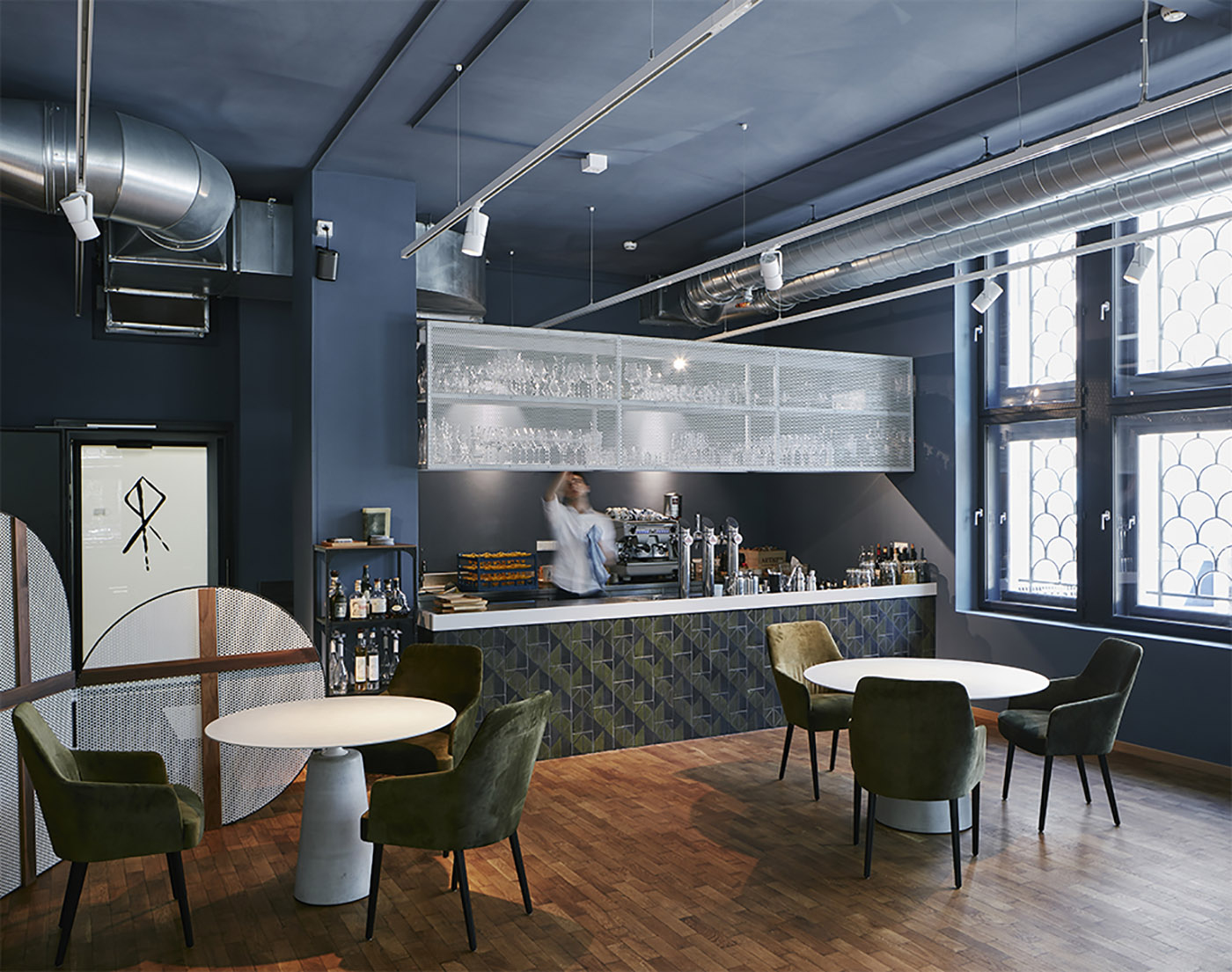 Al piano terra della struttura lo stile minimalista dell’Herzig, progettato dallo studio di interior design BÜRO KLK, è arricchito dalla storicità del contenitore architettonico con le sue alte finestre dalle inferriate decorate, dalla raffinatezza dei materiali di arredi e finiture e dall’elegante blu spento delle pareti
