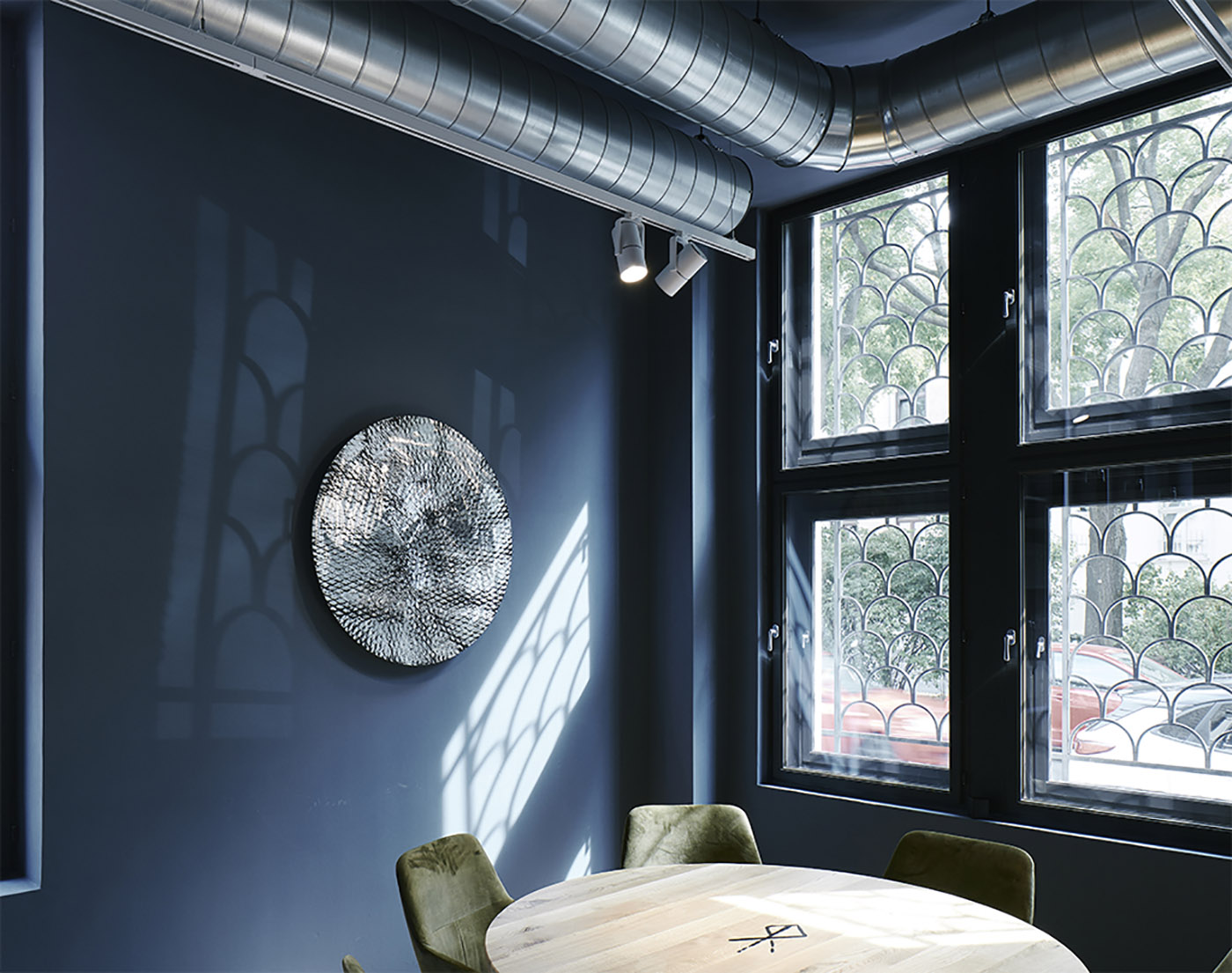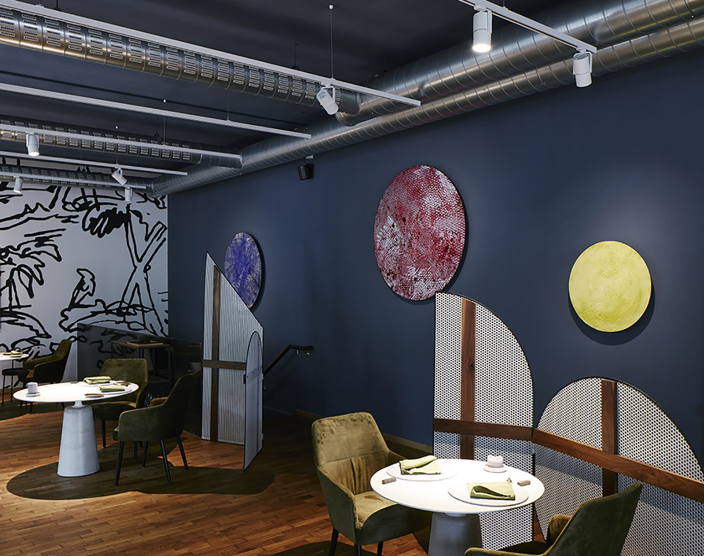 Le pareti sono vivificate dall'arte di Clemens Wolf nei colori CYMK e da un grande pezzo di Peter Jellitsch. A definire una volta per tutte l’identità eccentrica e cool del ristorante viennese, dei separè in legno e rete metallica dalle varie forme geometriche si distribuiscono nello spazio a creare dinamicità, decoro e sensazione di intimità protetta per i commensali.