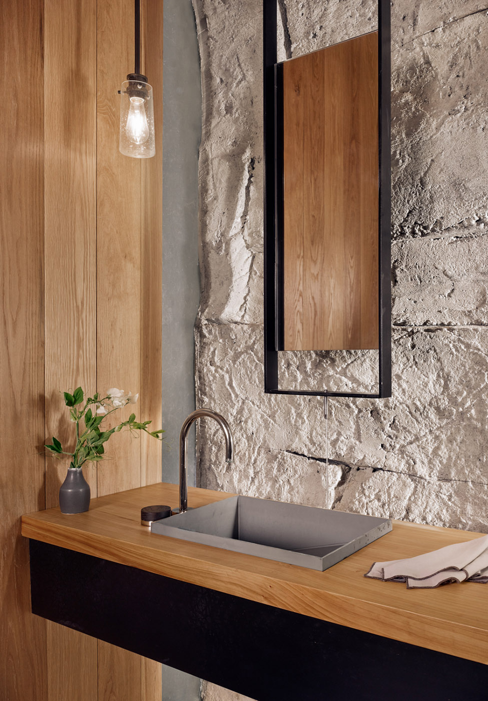 Gli interni sono rivestiti di quercia bianca, sia grezza che ebanizzata, che si mescola con l'abete Douglas a venature verticali, un caldo contrasto con il cemento e la pietra tutt'attorno. Le finestre in acciaio e legno separano interno ed interno. Quest'ultimo richiama l'immagine di “una nave in una bottiglia”, come afferma l'architetto capo del progetto, “i componenti dell'inserto in legno solo volutamente lasciati lontani dalle pareti della grotta in modo che la stanza rimanga adattabile”