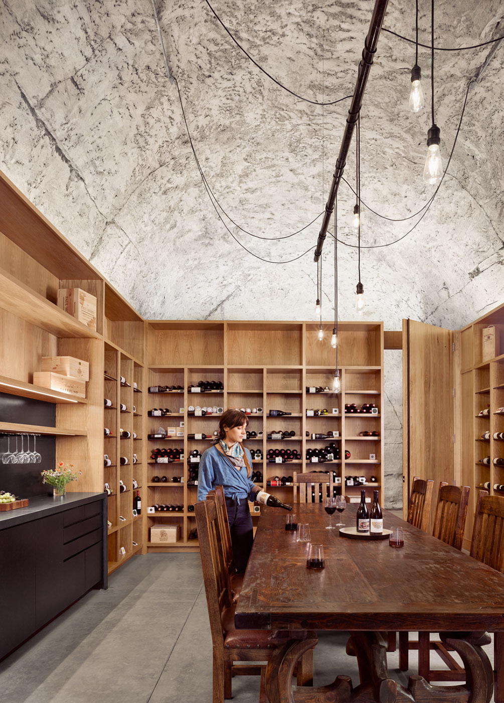 Un tunnel esistente nasconde una sala degustazione, un bar, una cantina e un bagno. L'apertura della grotta è sormontata da un portale di cemento, formato da tavole che conservano strutturalmente l'ingresso. Il cemento è destinato a patinare ulteriormente con il tempo, muschio ed edera si arrampicano ulteriormente alle pareti, fondendosi ulteriormente all'ambiente circostante