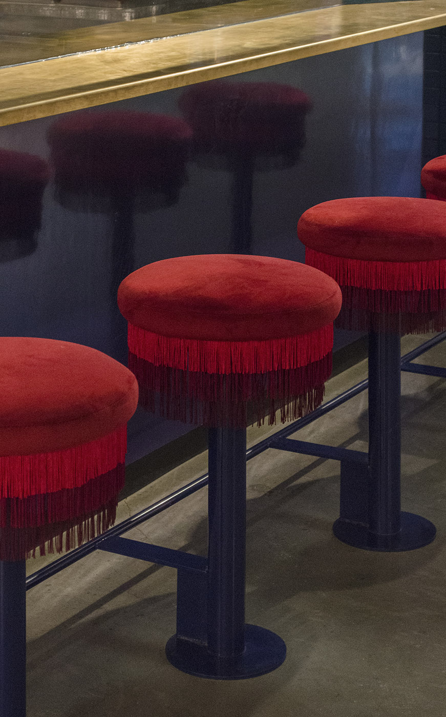 Quando ci si avvicina, si vede meglio la vetrina riflettente del bancone ricoperta di vinile iridescente che fonde il turchese pallido con il blu marino. Sul lato destro del chiosco, un bancone da pranzo in ottone con cinque sgabelli girevoli aspettano i clienti che preferiscono mangiare sul posto