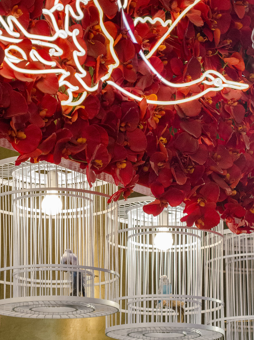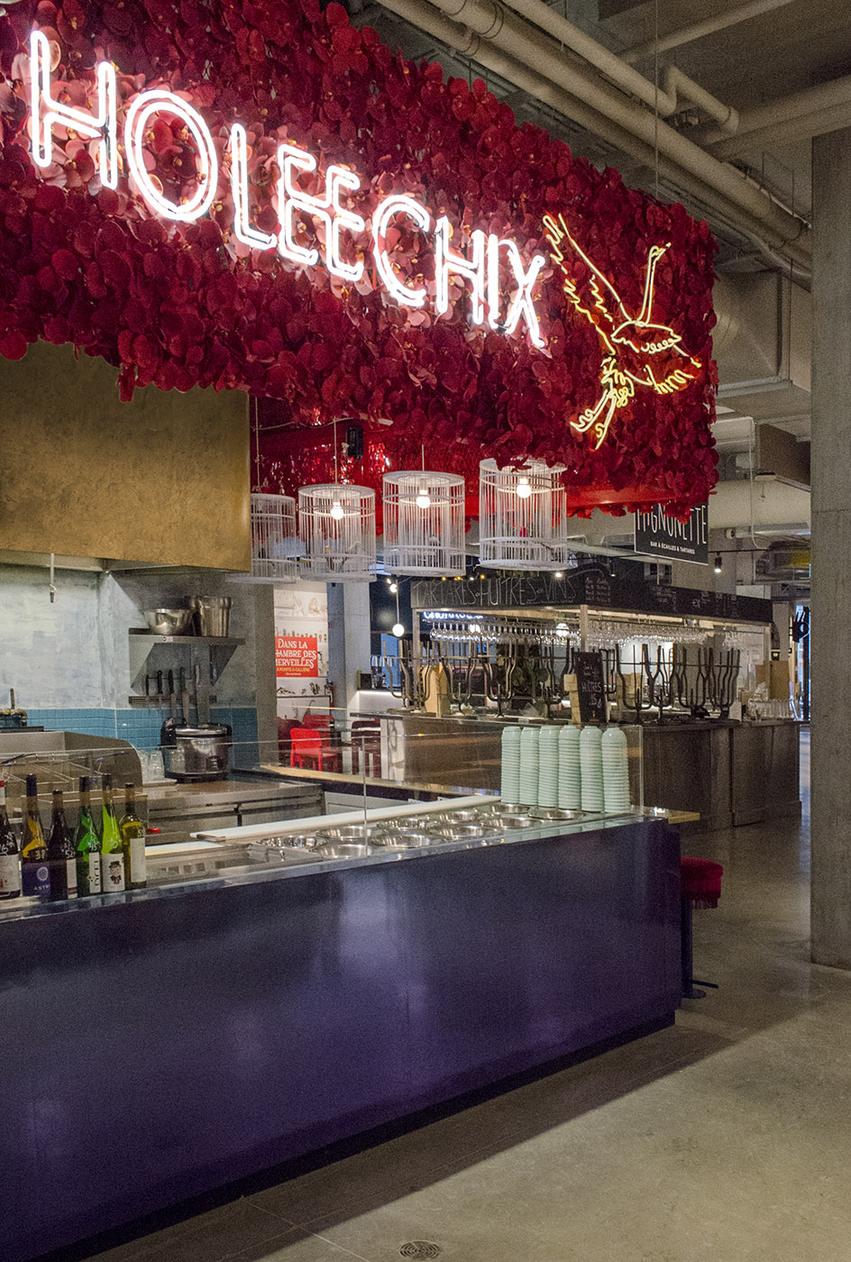 «Polli fritti e cineserie» è il tema che ha dettato il concept di Ivy Studio Un'imponente marchesa vestita con centinaia di fiori rossi, come i fiori di pruno cinesi, sovrasta l'intero chiosco. Le insegne Ho Lee Chix e le gru al neon intermittenti catturano l'attenzione dei pedoni provenienti da ogni direzione e rafforzano l'atmosfera stimolante dei mercati di strada di sera