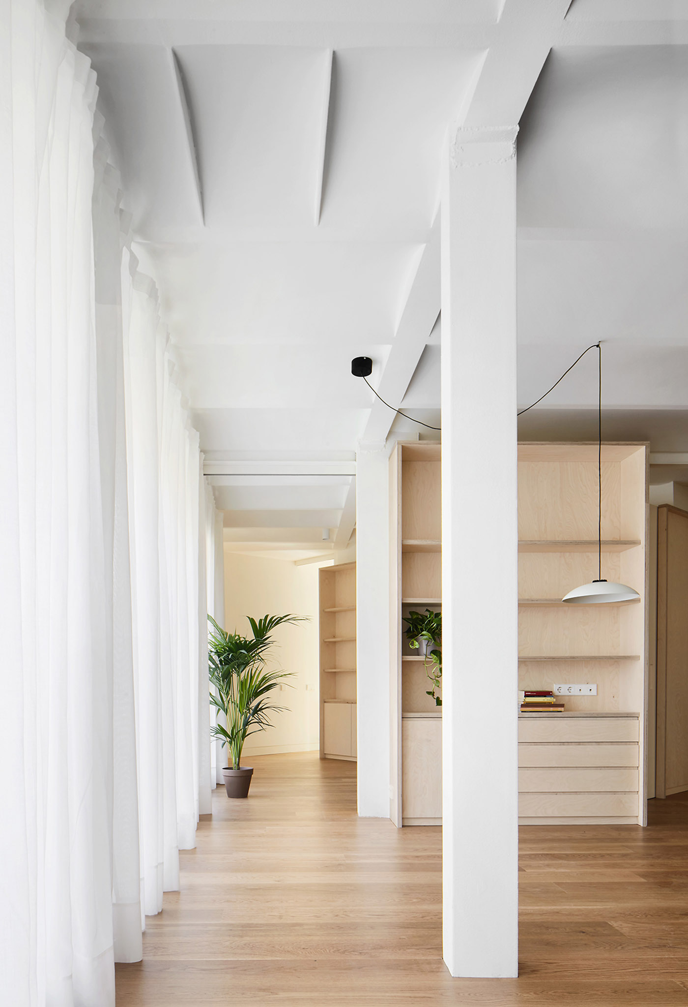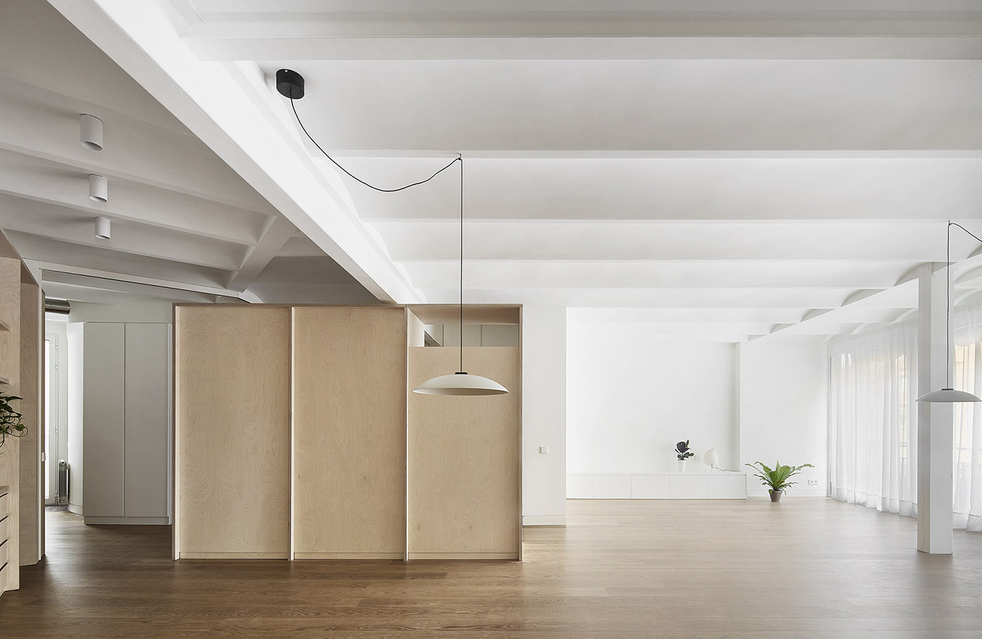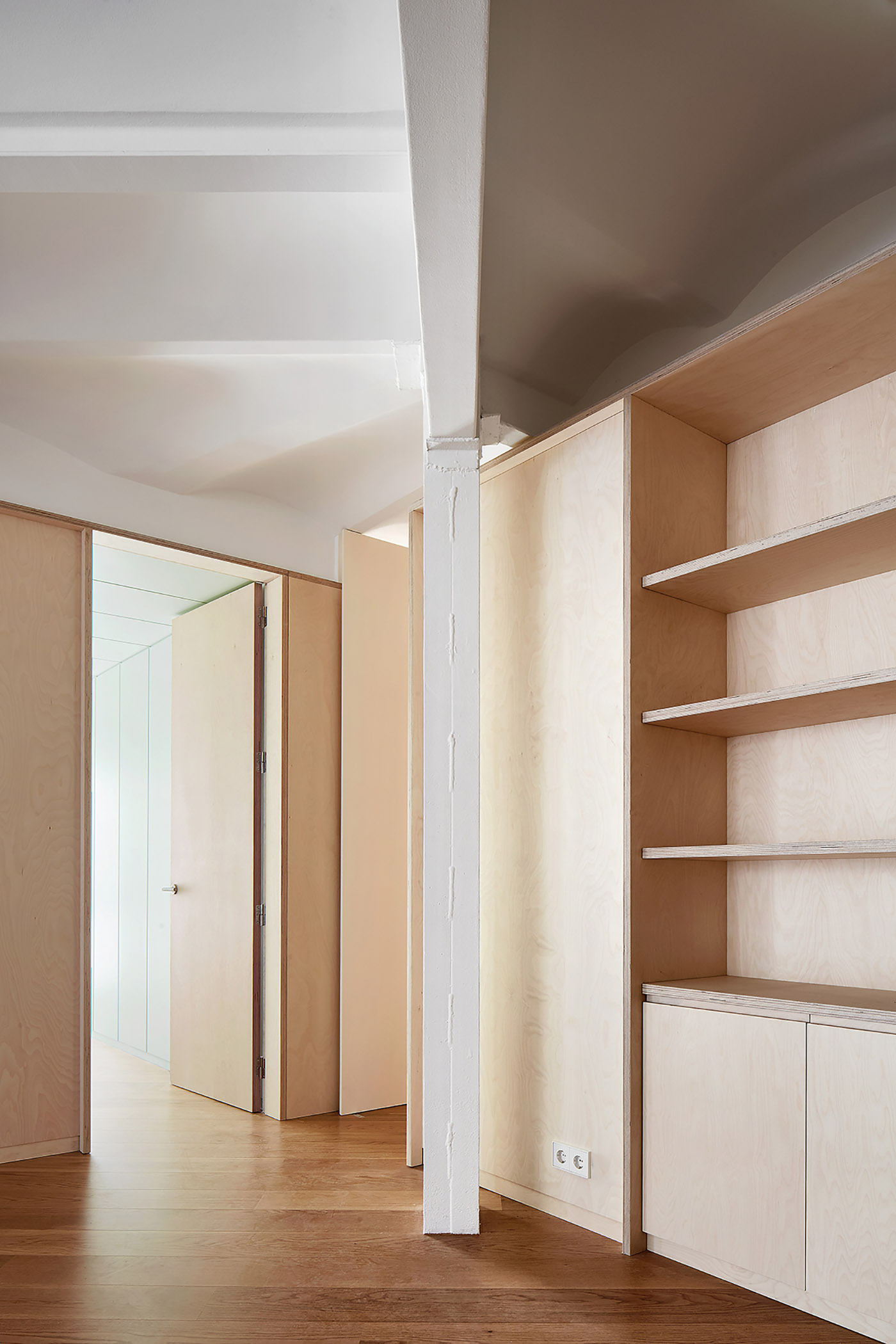 Precedentemente lo spazio era organizzato in una serie di piccole stanzi e corridoi con funzioni definitive, modellati da pareti non portanti. Demolendo le pareti, viene definito un involucro permanente all’interno del quale verranno organizzati ambienti abitabili tramite piccoli interventi . Il legno viene utilizzato per sottolineare il divorzio tra spazio e struttura