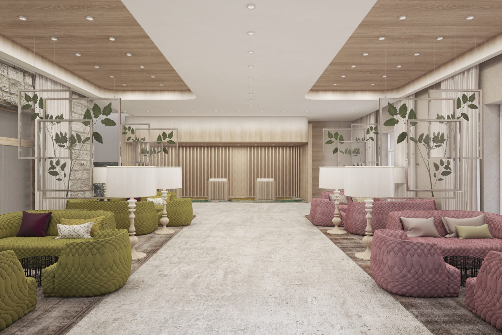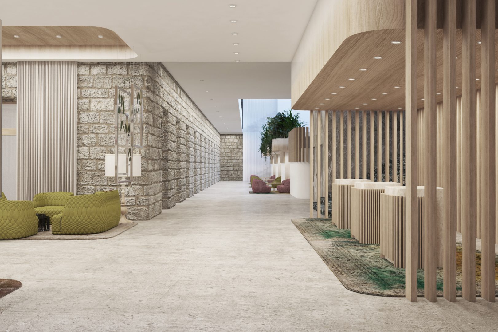 Nel progettare l'area del foyer, l'obiettivo principale è l'accurata integrazione degli edifici esistenti, come i muri in pietra naturale originale, nel nuovo concept spaziale