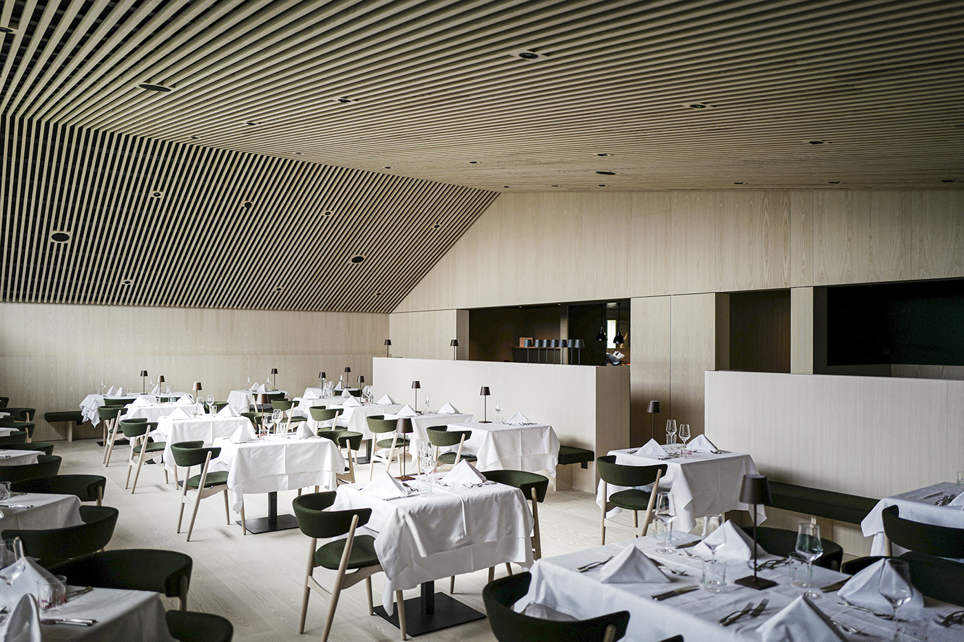 Il legno di frassino viene accostato ai tipici tessuti verdi del loden, che con un tocco di colore danno continuità alla tavolozza naturale del paesaggio circostante. Il legno è il protagonista principale del progetto, sia all'esterno che all'interno, e si crea contrasto tra il legno annerito esterno e il legno chiaro interno