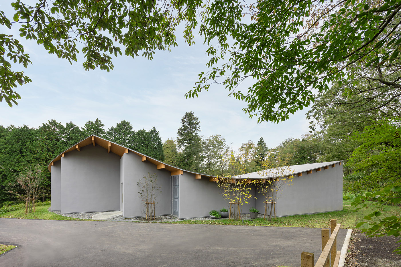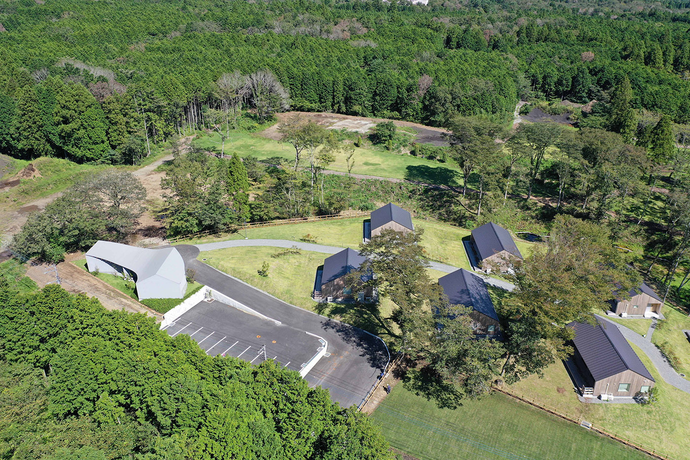 La strada che corre da Gotemba, Shizuoka, al Monte Fuji, parte di un’immensa foresta dove mormora un piccolo ruscello, accoglie la reception dell’hotel, che si estende nell’ampio paesaggio. Il cliente si affida a Takashige Yamashita Office per la pianificazione di strutture ricettive in quest’area e di un punto di accoglienza