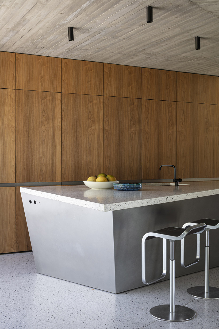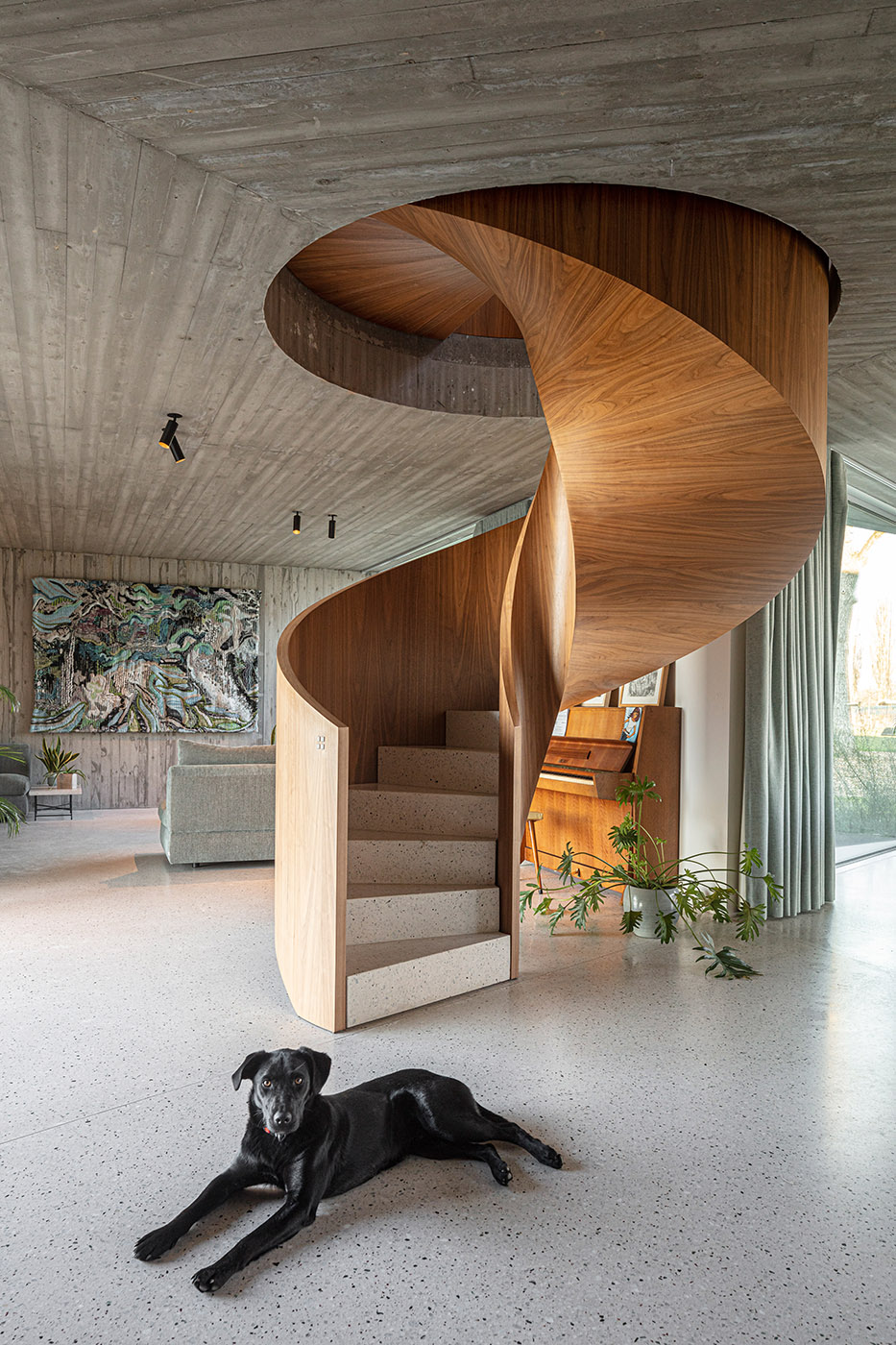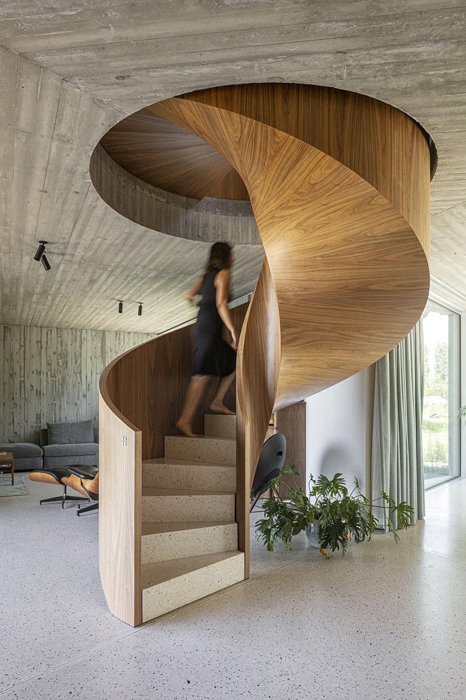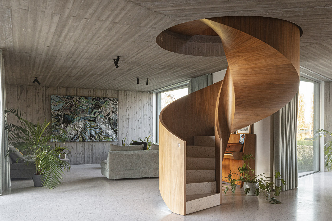 Gli interni si caratterizzano in legno e cemento a vista. Al piano superiore, la casa conserva la forma rettangolare del fienile originario, ospitando le camere da letto dei bambini e dei genitori. I progettisti erano anche stati incaricati di adattare una "stanza dei giochi" in questo spazio, una sfida importante dati i piccoli metri quadrati con cui si avrebbe dovuto lavorare