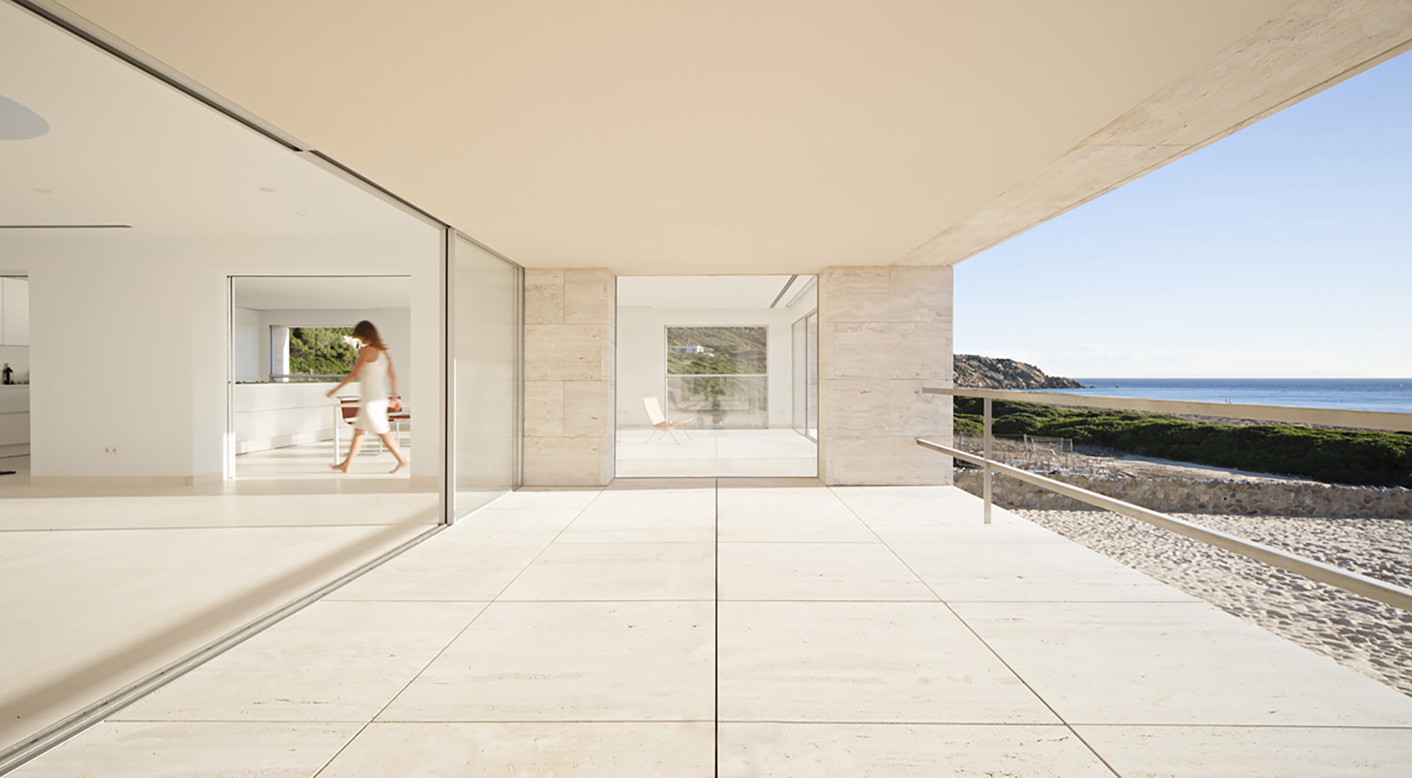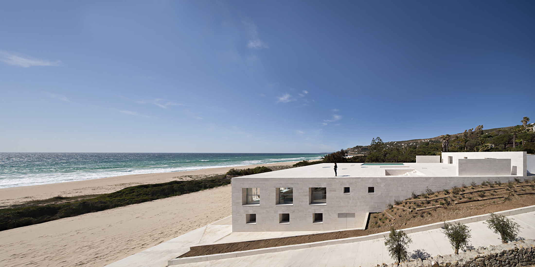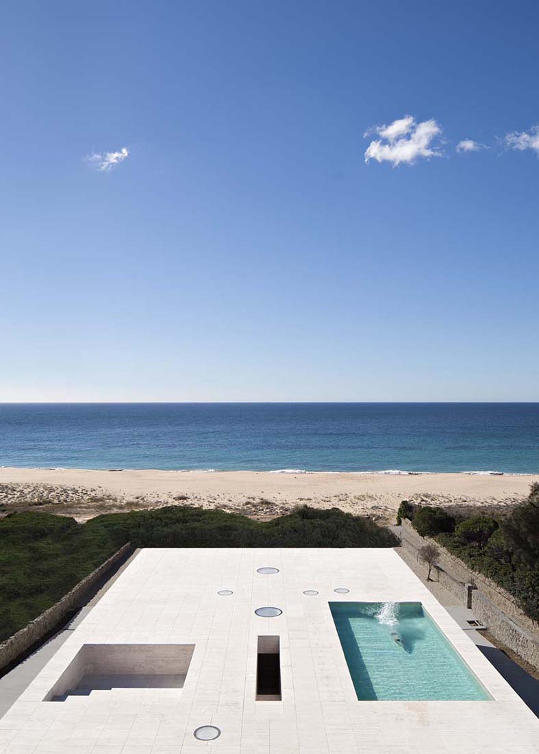 La Villa, progettata dallo Studio Alberto Campo Baeza, si solleva come un piano infinito ai margini delle acque dell'Oceano Atlantico, costruita come se fosse un molo sul lungomare. La struttura in travertino si confonde con la sabbia e la piscina sembra un continuo del mare