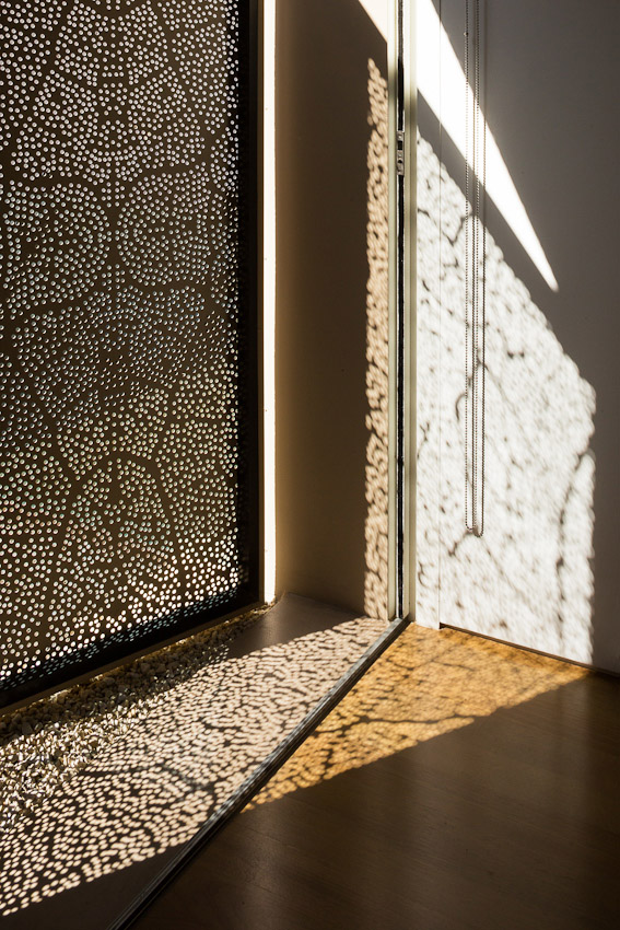 Grazie ai pannelli di metallo perforato che rivestono l'abitazione, gli spazi interni si arricchiscono di punti luminosi in movimento, a seconda della posizione del sole. Inoltre, per portare la luce naturale fin al piano interrato, i progettisti hanno inserito una corte interrata. La camera da letto padronale ha una grande finestre verso il cortile, una piccola oasi all'interno della città