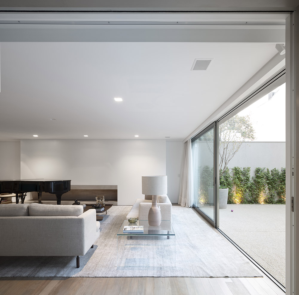Le porte a libro tra la sala da pranzo, la dispensa e il corridoio consentono di creare diverse configurazioni, rendendo flessibile l'uso della casa. Nel soggiorno, le porte scorrevoli permettono una completa integrazione con il cortile. L'abitazione si presenta come un misterioso monolite sulla strada, introducendo un interessante rapporto tra privato e sociale