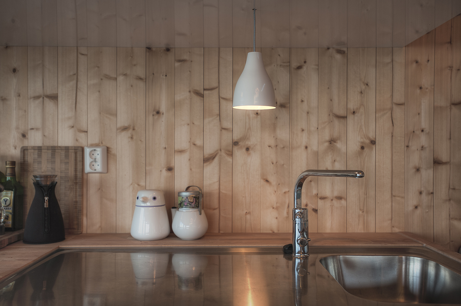 I clienti stessi hanno fatto la maggior parte dei lavori di costruzione L'esterno dell'edificio è rivestito in abete raccolto dalla foresta del cliente. Questo materiale non trattato si attenua rapidamente, raggiungendo una tonalità luminosa e argentea. I dettagli esterni sono ridotti al minimo per garantire una patina uniforme per le pareti